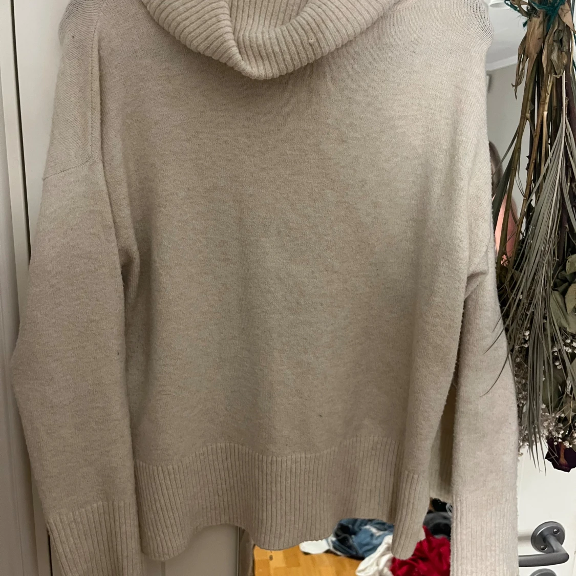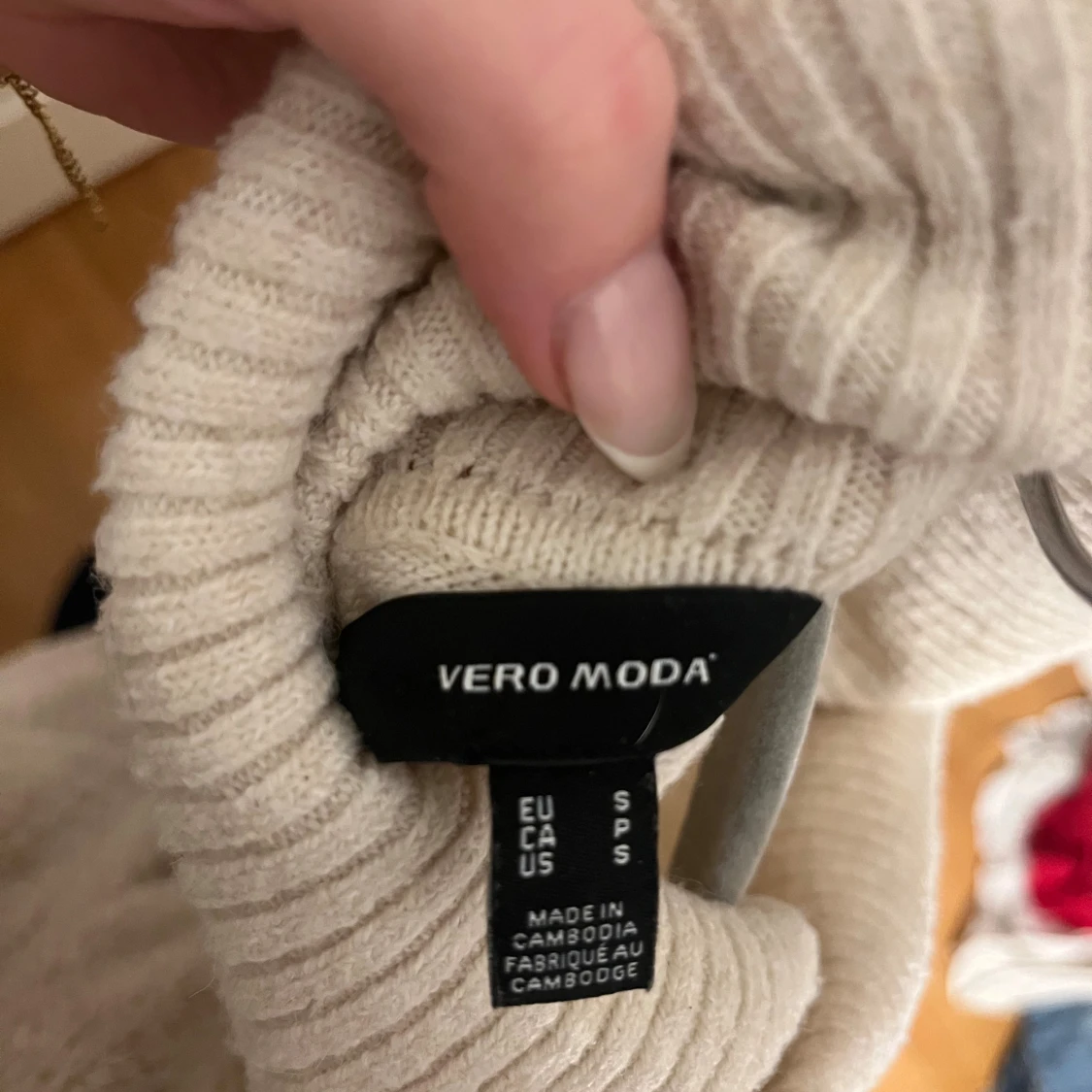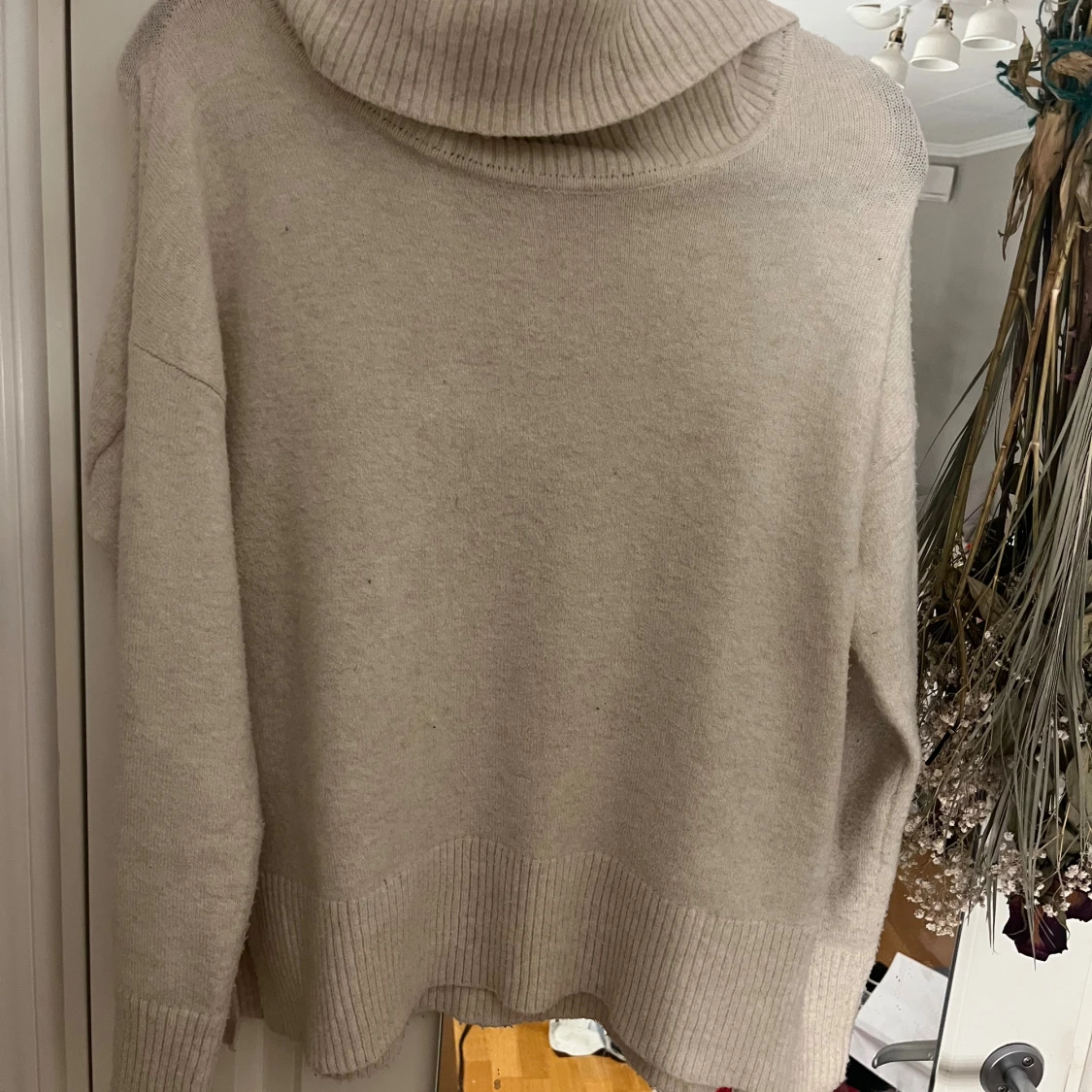 Beige polotröja från Vero Moda i storlek S. Tröjan har en bred, ribbad polokrage och ribbade muddar vid ärmslut och nederkant. Den är stickad och har en loose passform med långa ärmar.