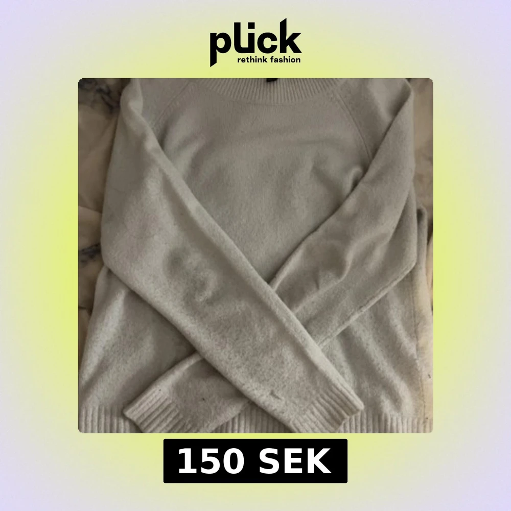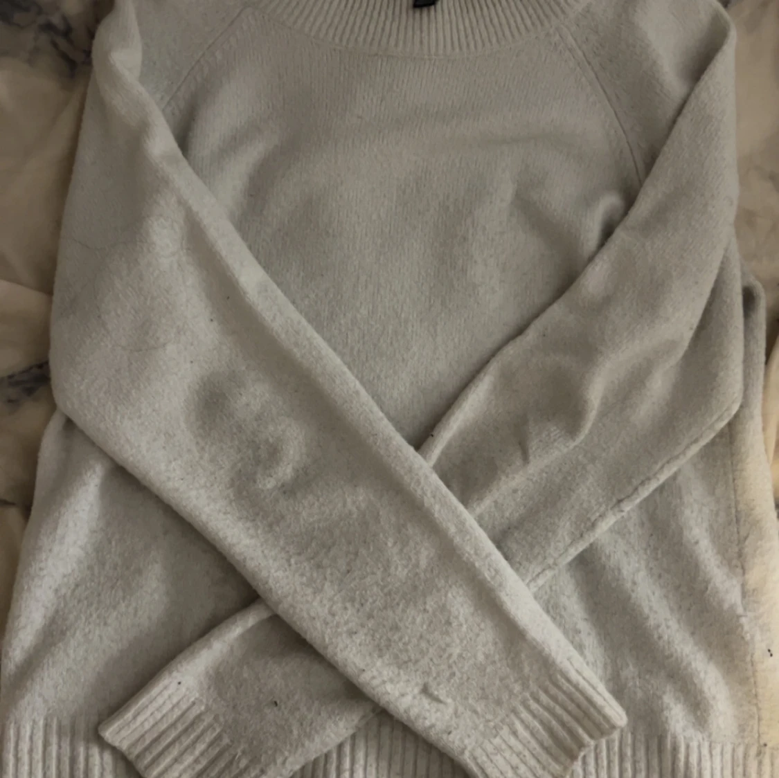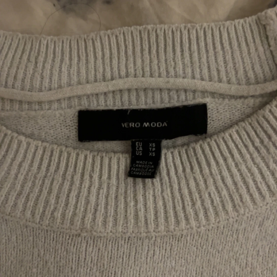En stilren vit stickad tröja från Vero Moda i storlek XS. Tröjan har rund halsringning, långa ärmar och breda ribbade muddar vid ärmslut och nederkant.