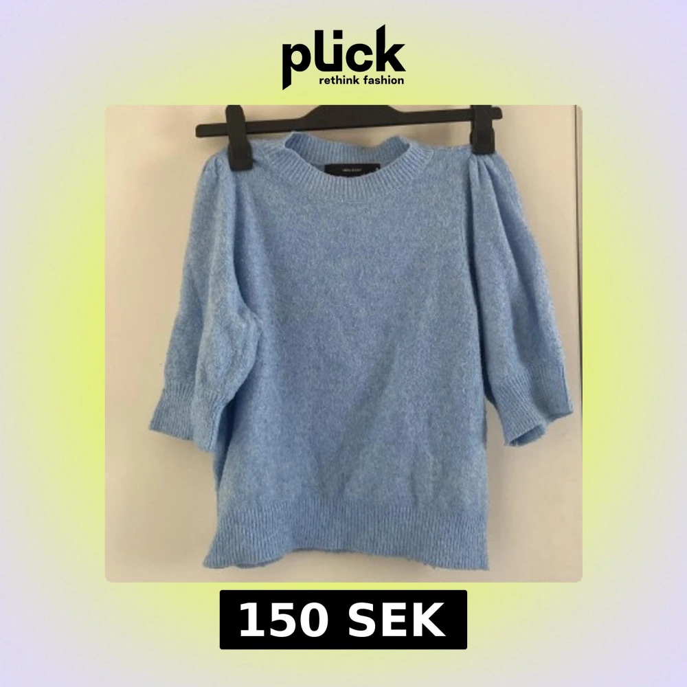 Superfin ljusblå stickad tröja från Vero Moda i storlek XS. Tröjan har trekvartsärmar med lätt puff vid axlarna och bred ribbad mudd vid ärmslut och nederkant. Perfekt för lager-på-lager och ger en chill men ändå söt vibe.