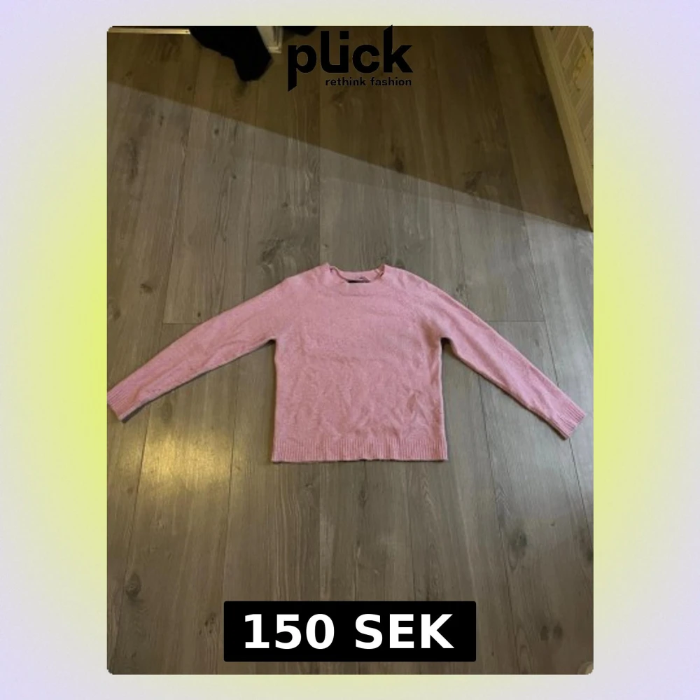 Säljer en ljusrosa stickad tröja med rund hals och långa ärmar. Tröjan har ribbade muddar vid ärmslut och nederkant, vilket ger en snygg och enkel look. Perfekt för att hålla sig varm under kyliga dagar.