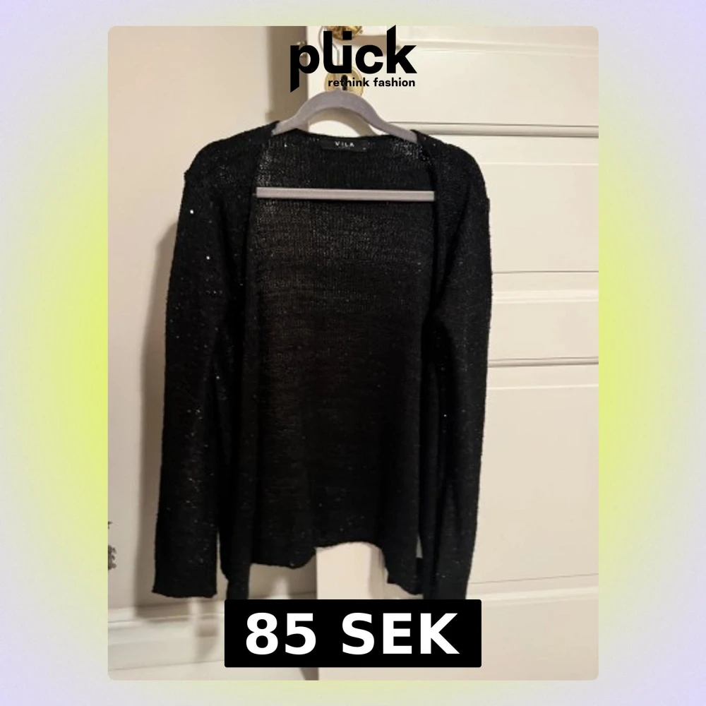 Svart öppen kofta från Vila med glittriga paljettdetaljer. Långärmad och stickad i ett lätt material som ger en snygg och luftig känsla. Perfekt för utgång eller nyår 🍾🎊