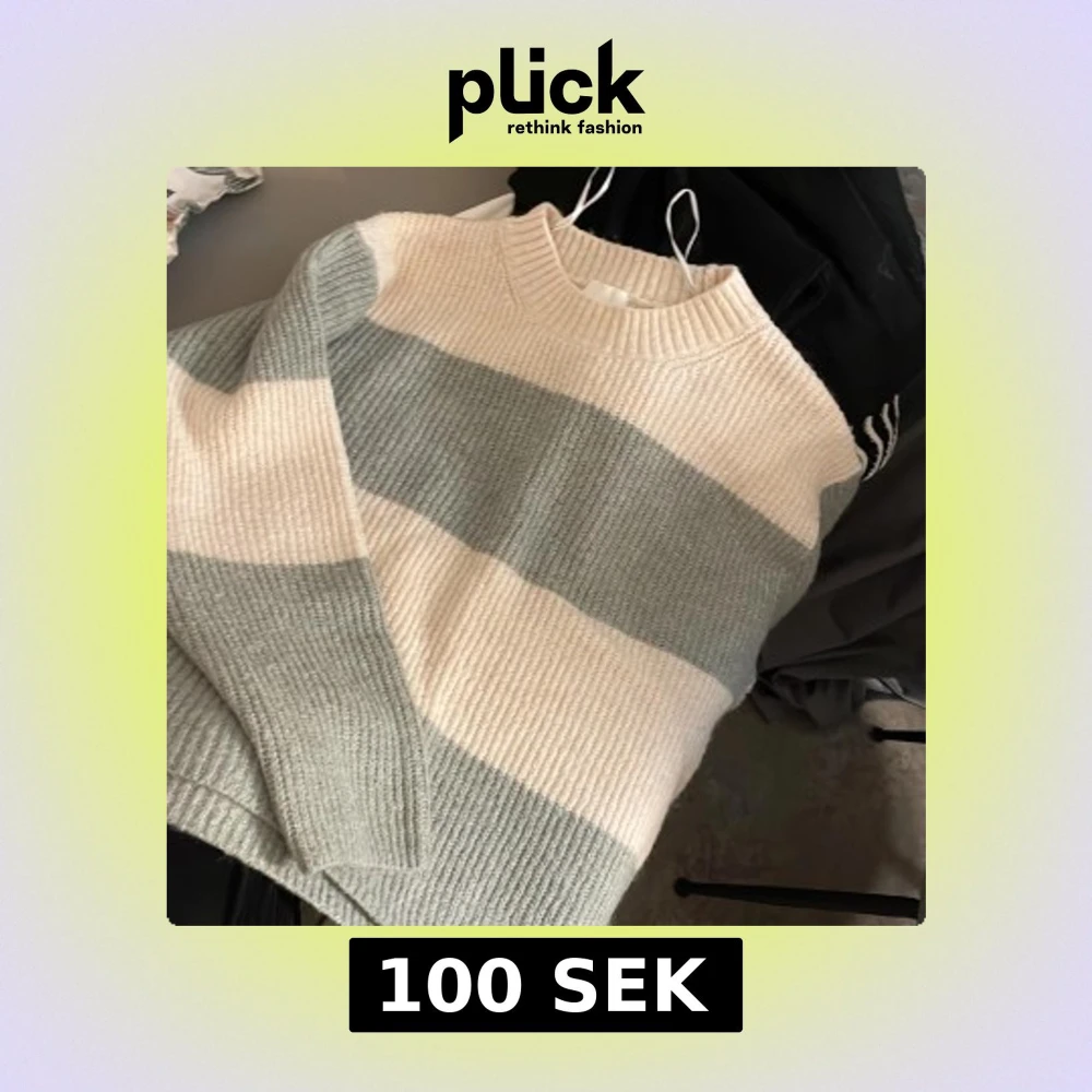 Supermysig stickad tröja med breda ränder i ljusgrått och vitt. Tröjan har rund halsringning och ribbade muddar. Perfekt för lager-på-lager och chill dagar.