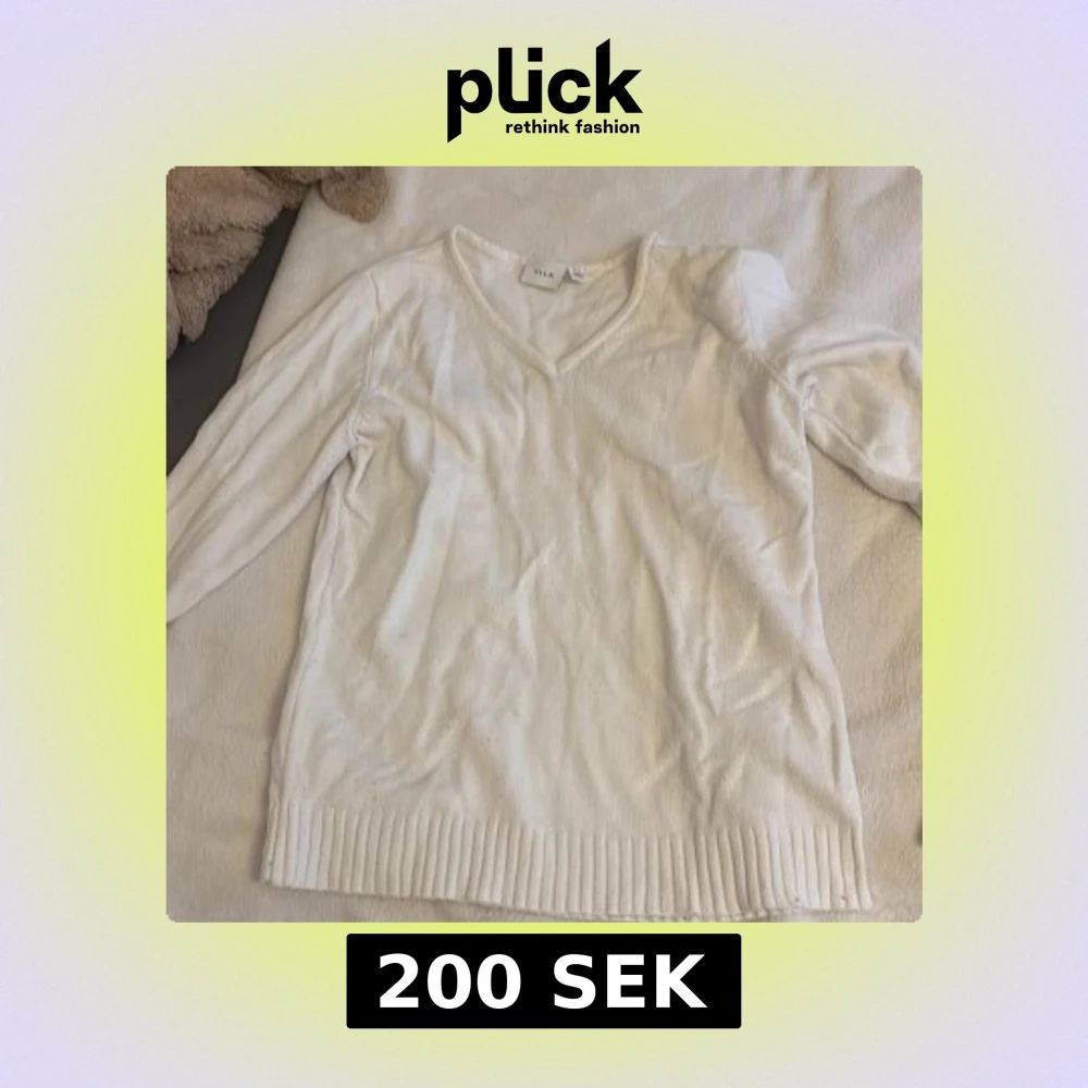 Vit stickad tröja från Vila med v-ringning och långa ärmar. Tröjan har ribbade muddar vid ärmslut och nederkant, vilket ger en snygg och enkel look. Perfekt att matcha med jeans eller kjol för en clean stil. Dock är den lite nopprig, vilket kan ses i sista bilden.