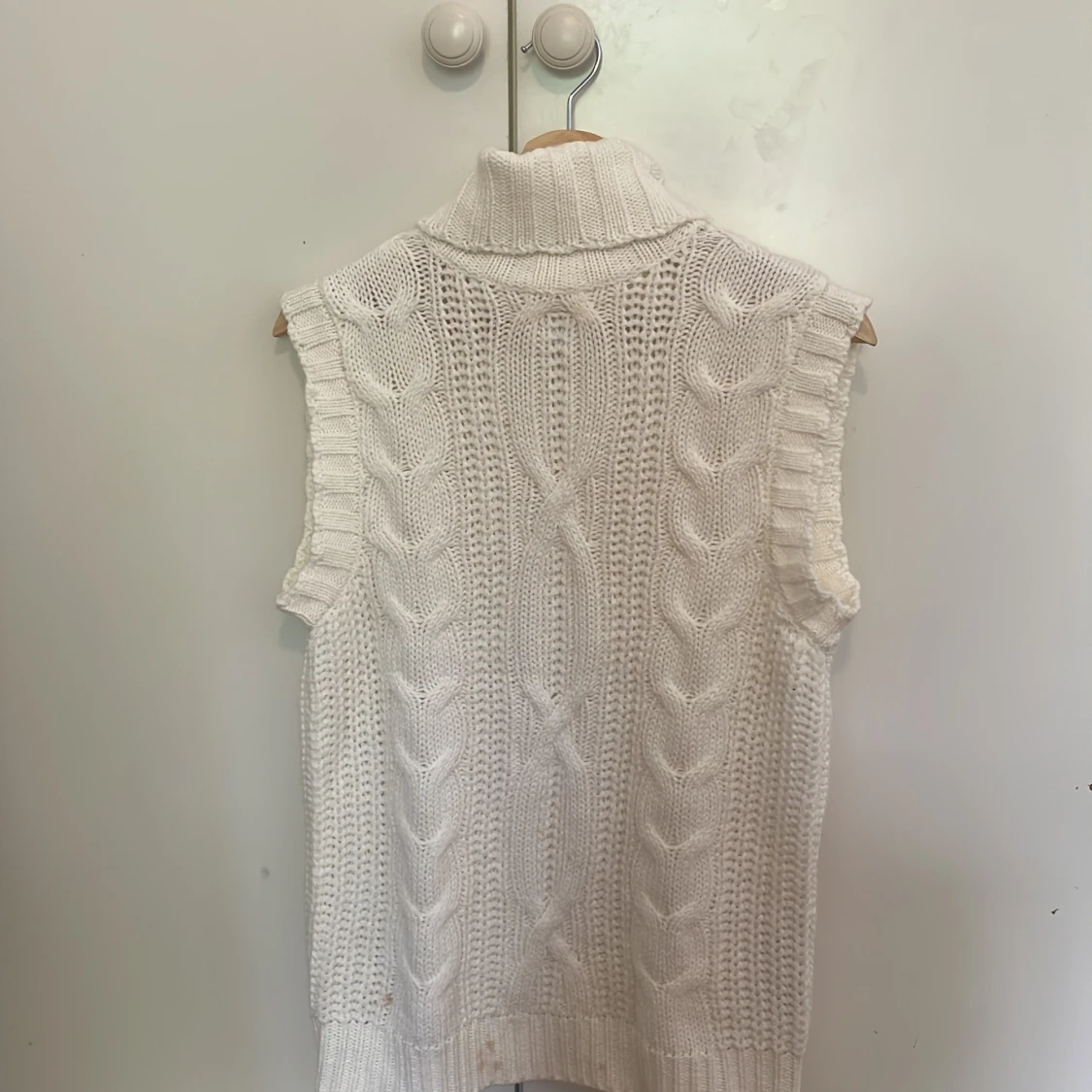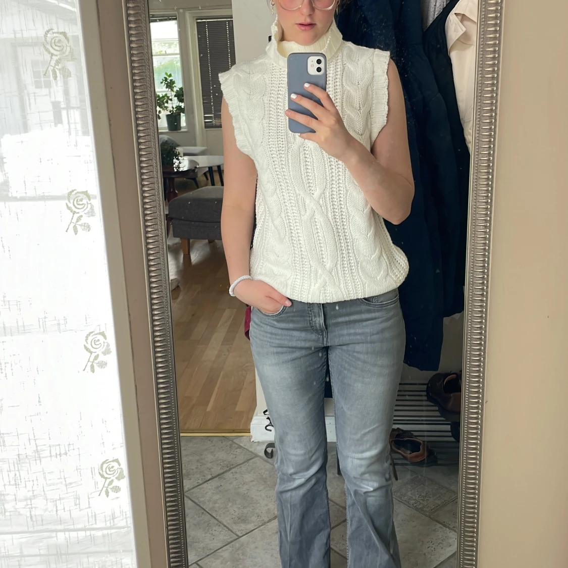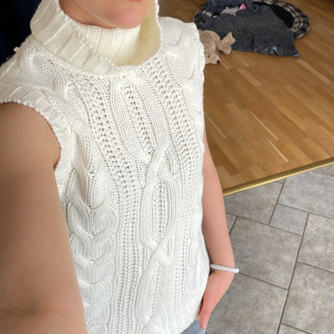Säljer en vit stickad väst med polokrage och breda ärmhål. Västen har ett klassiskt kabelstickat mönster framtill och ribbade kanter. Perfekt att styla över en skjorta eller långärmad tröja.