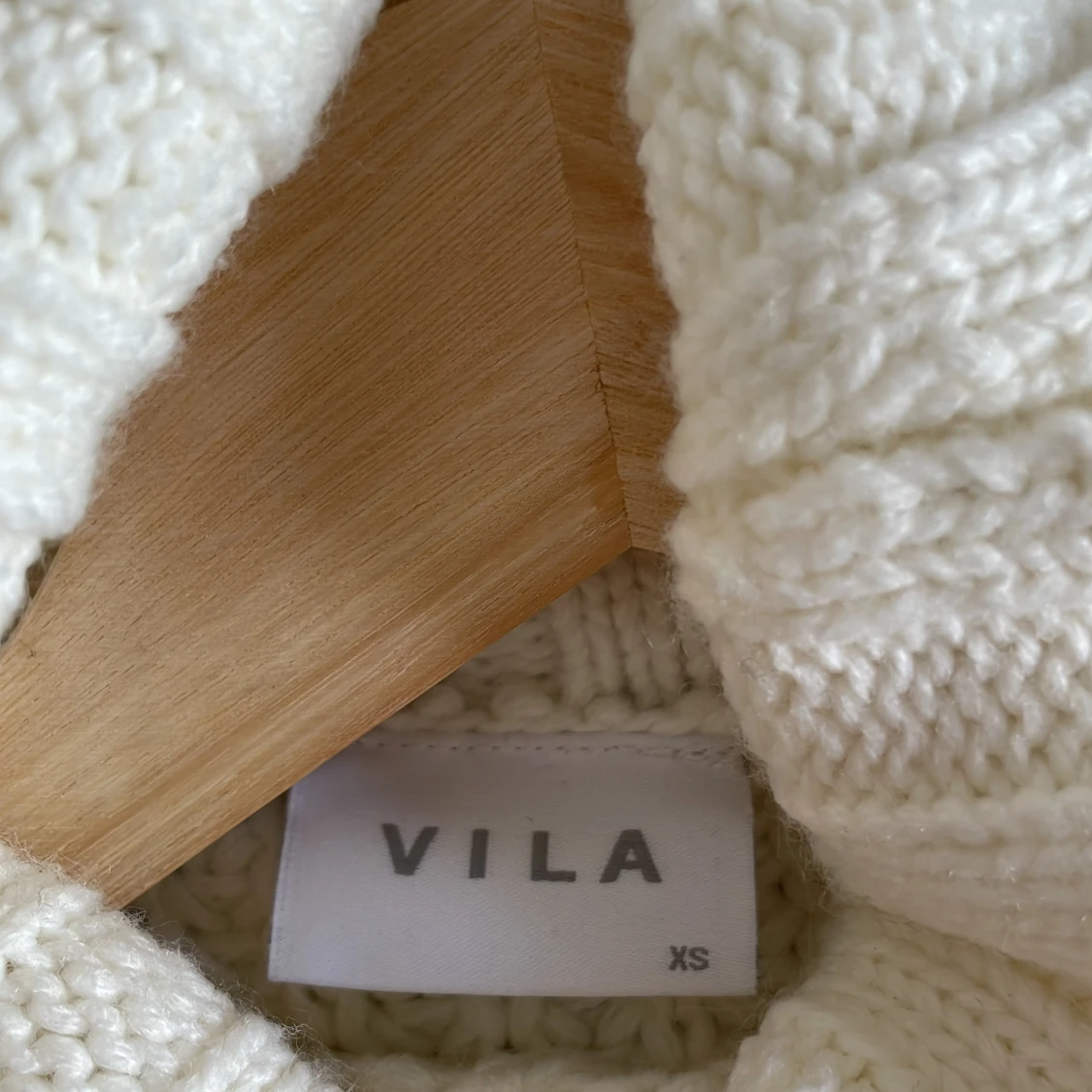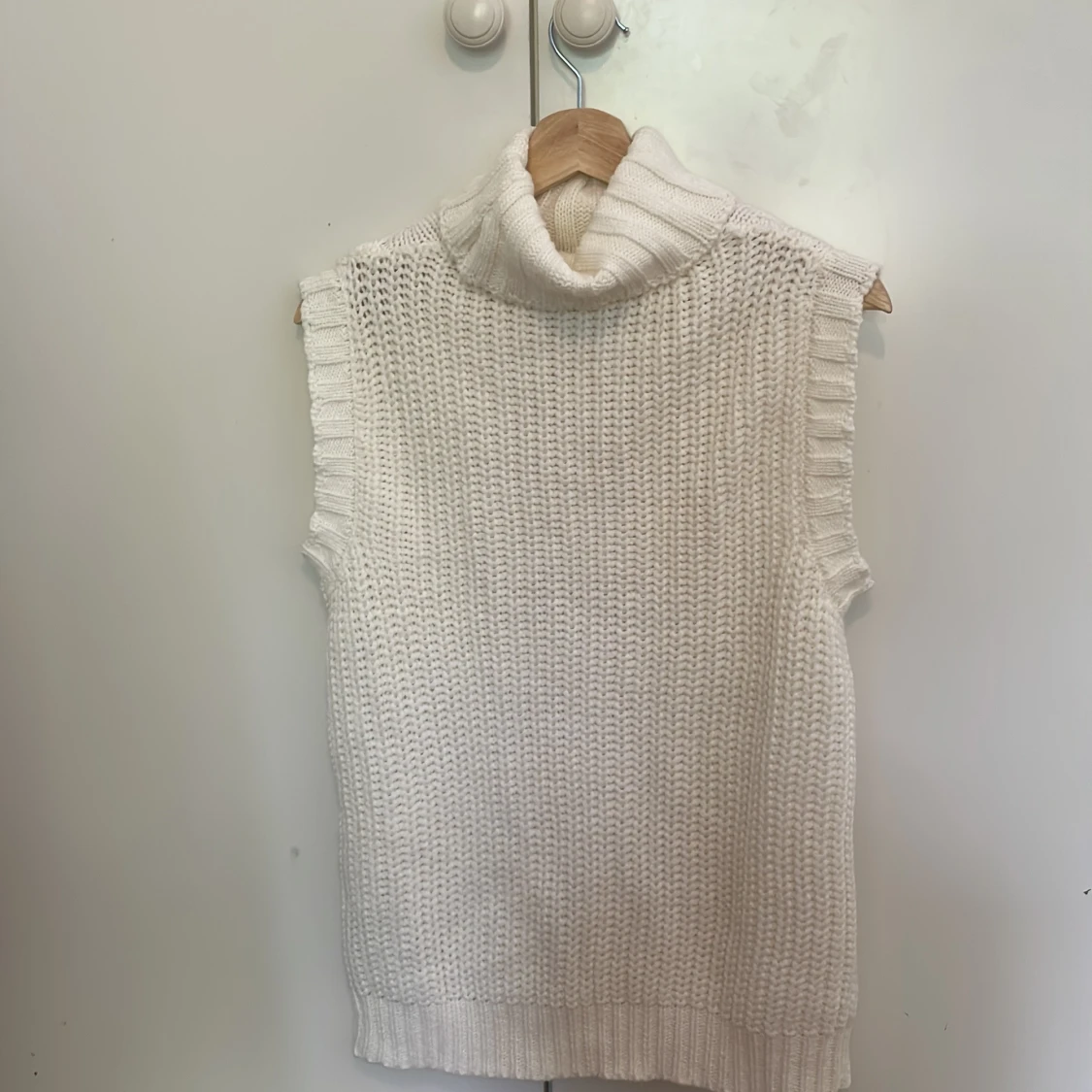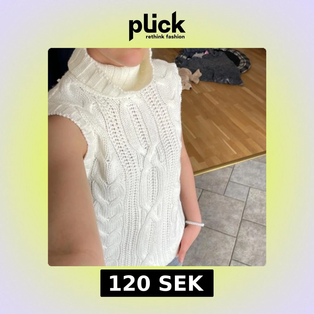 Säljer en vit stickad väst med polokrage och breda ärmhål. Västen har ett klassiskt kabelstickat mönster framtill och ribbade kanter. Perfekt att styla över en skjorta eller långärmad tröja.