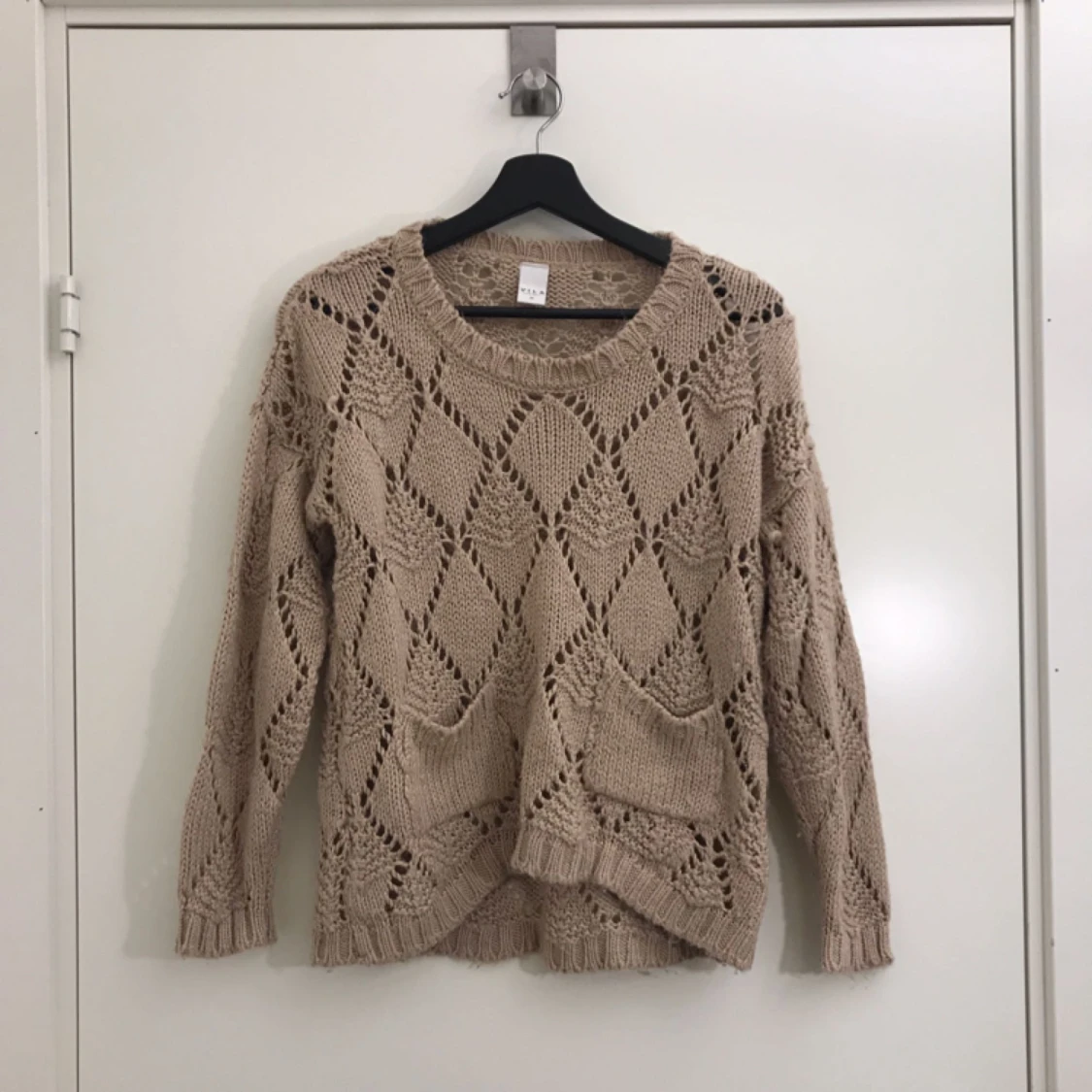 Beige stickad tröja i storlek XS, men passar även en S. Tröjan sitter löst nertill och har två fickor. Hämtas i Uppsala eller fraktas till önskad adress.