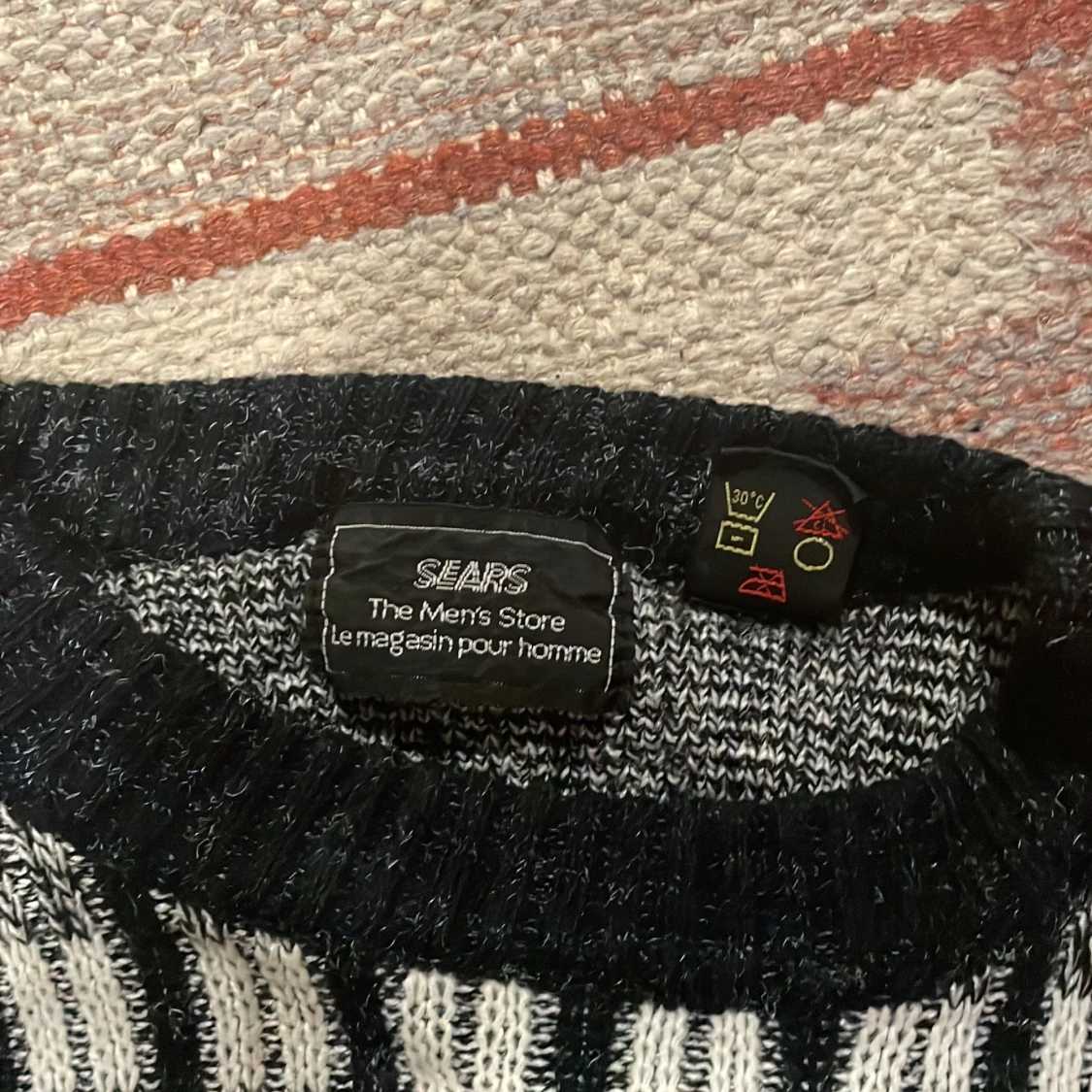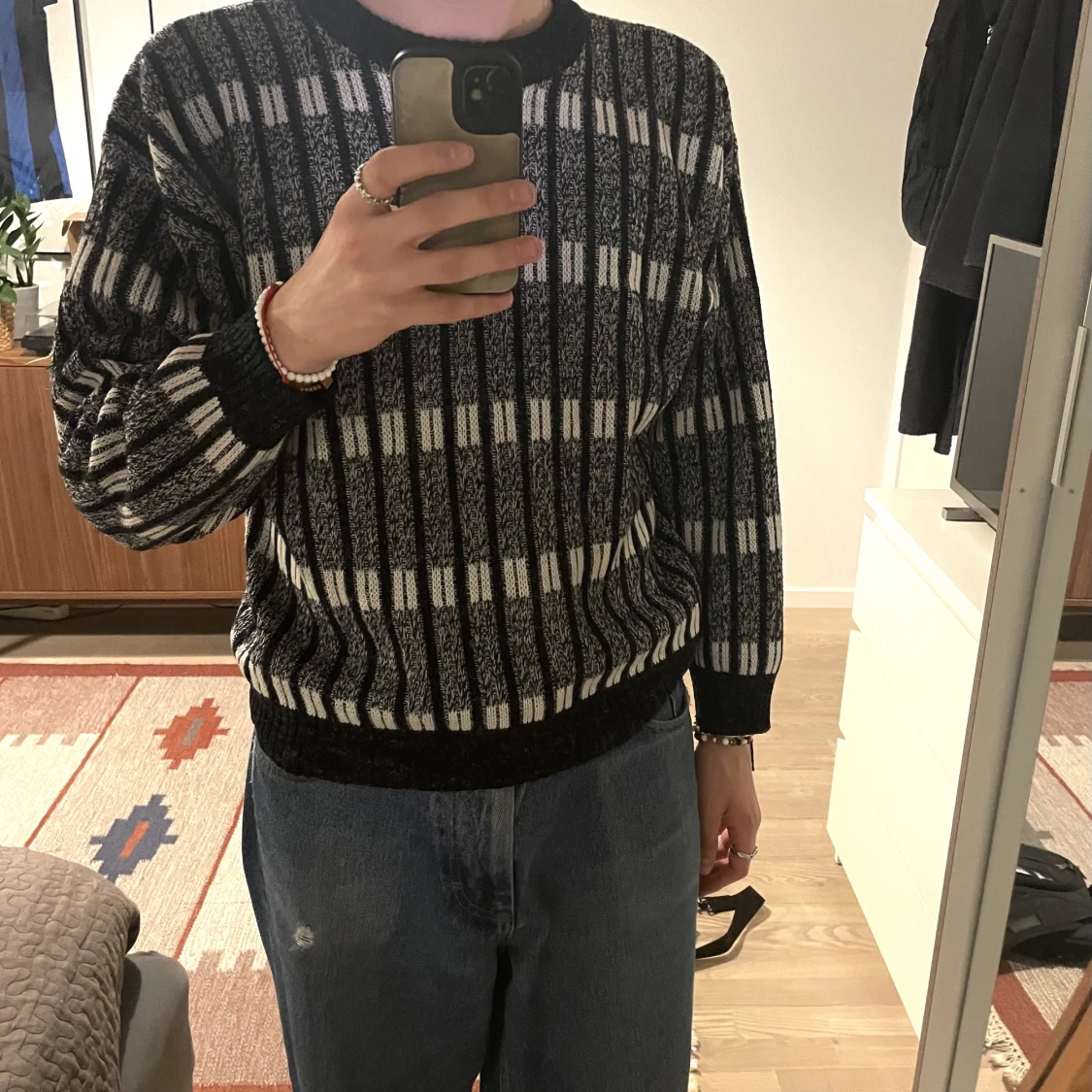 En stickad tröja köpt second-hand. Använd ett par gånger men säljer den då jag tycker att den är lite för kort i ärmarna