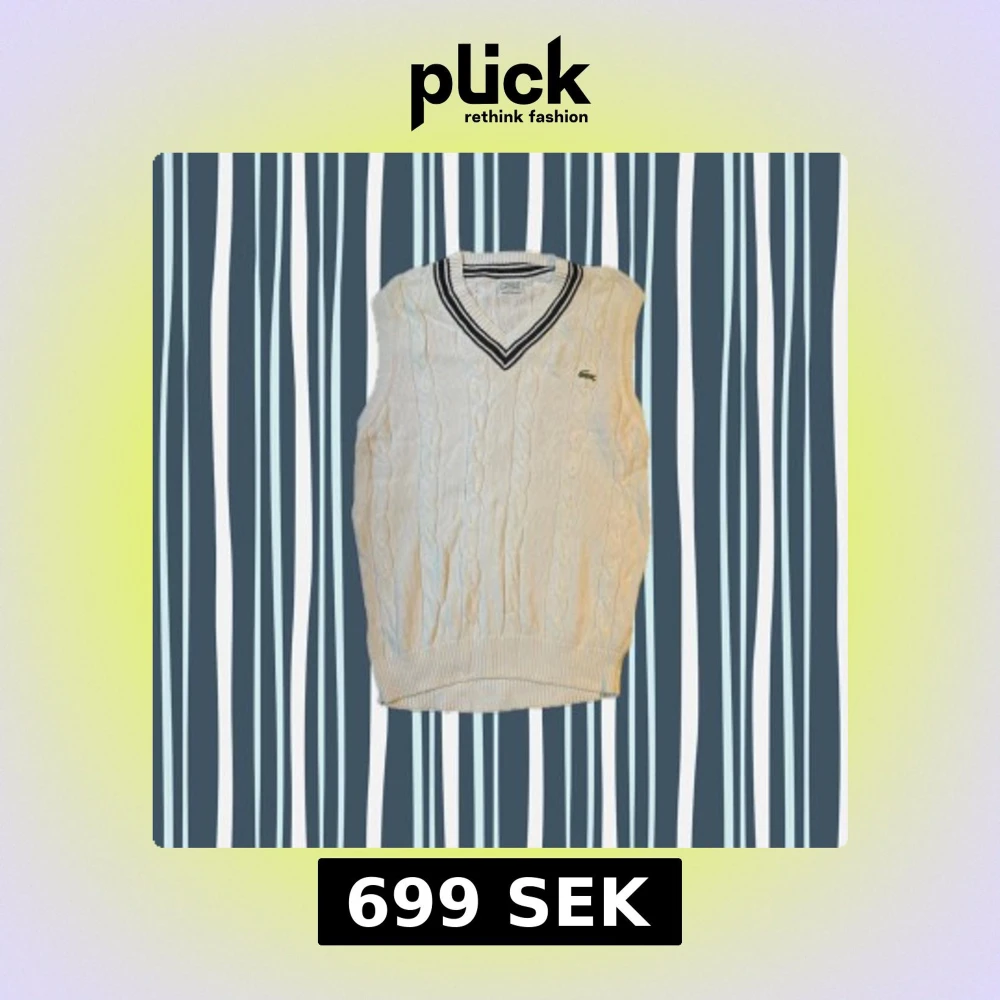 Kabelstickad vit väst/ sweater vest från Lacoste Sport med klassisk v-ringning och mörkblåa ränder runt kragen. Köpt på en vintage butik och aldrig använd av mig. Funkar för både män och kvinnor. Nypris på liknande är >2000kr. Hör av dig om du har några frågor!