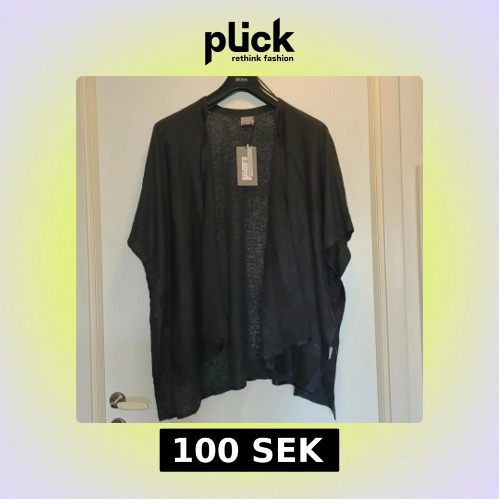 Helt ny mörkblå/grå kofta/poncho i oversized modell. Nypris 180 kr. Den är öppen framtill och har korta, vida ärmar. Stickat, mjukt material. Färgen syns bäst på andra bilden.