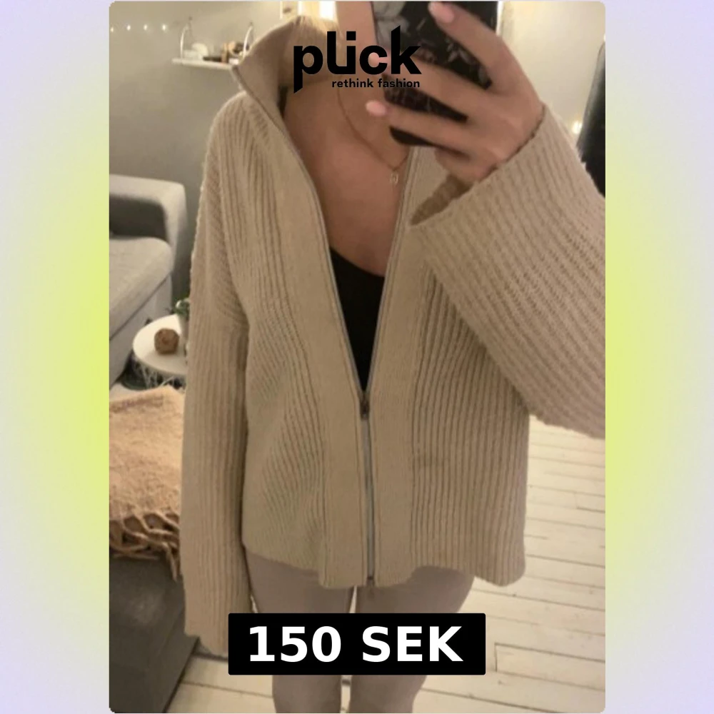 Mysig beige stickad kofta från 157 i storlek S. Koftan har en ribbad struktur, långärmade ärmar och en hel dragkedja framtill. Perfekt för lager-på-lager och chill dagar💞