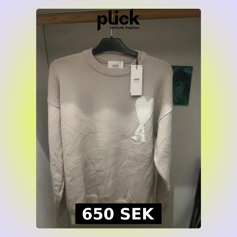 Säljer en beige stickad tröja från Ami Alexandre Mattiussi med ett stort vitt hjärta på bröstet. Tröjan har rund hals, ribbade muddar och lång ärm. Perfekt för dig som gillar stilrena detaljer och mjuka material.