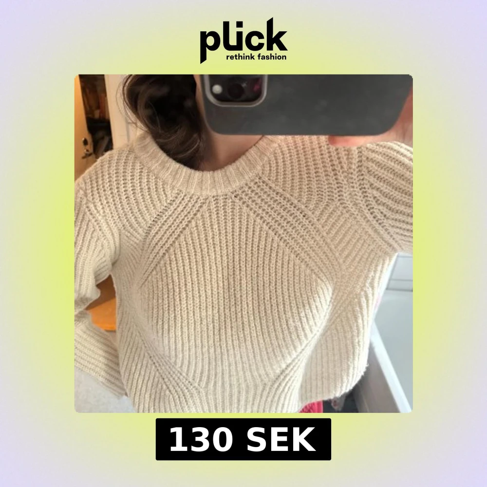 Säljer en mysig beige stickad tröja med ett snyggt mönster. Tröjan har långa ärmar och en rund halsringning. Perfekt för kyligare dagar!