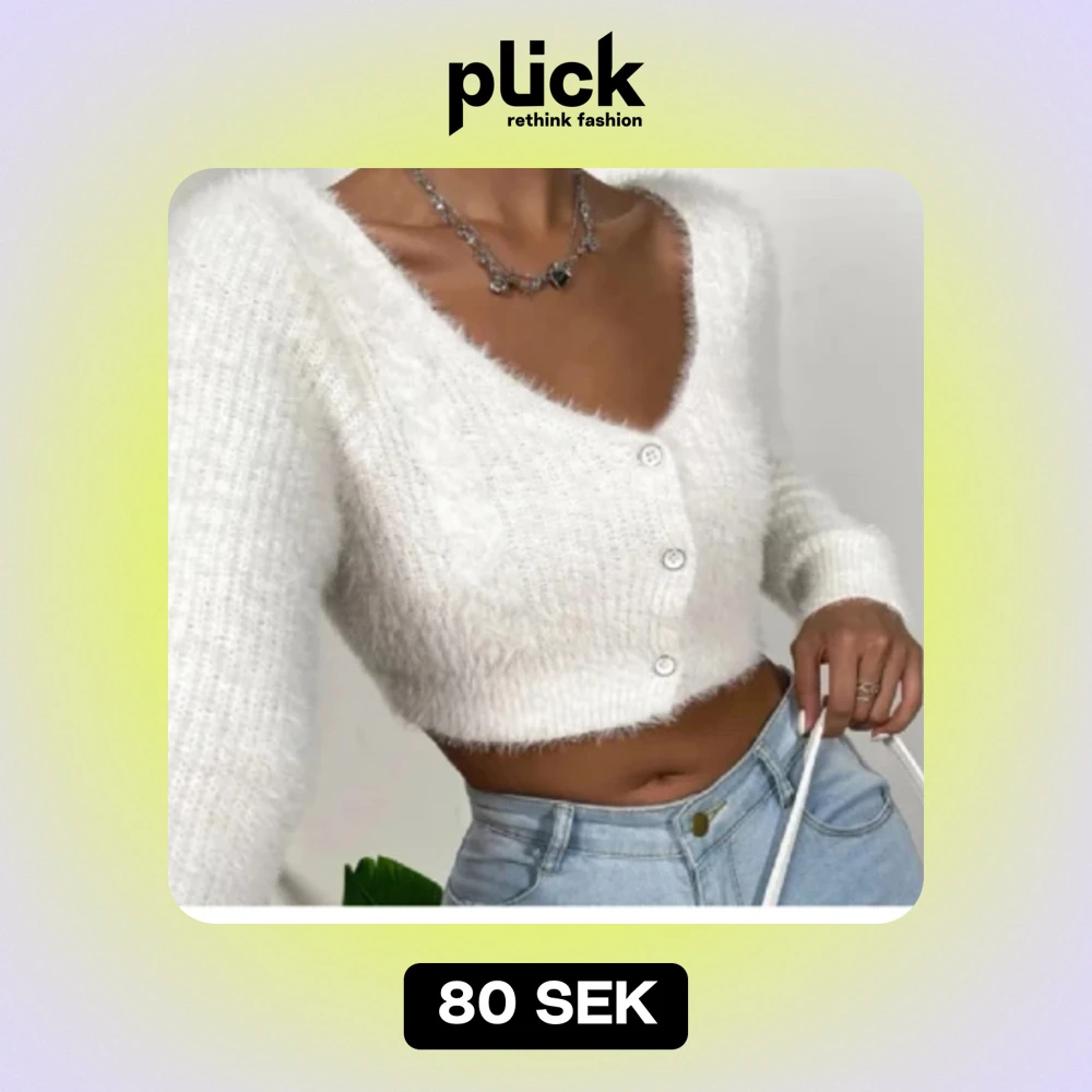 Säljer en supermysig vit fluffig kofta/tröja med knappar framtill. Den är croppad och har långa ärmar. Koftan är i ett mjukt stickat material och säljes pga att den inte kommit till användning