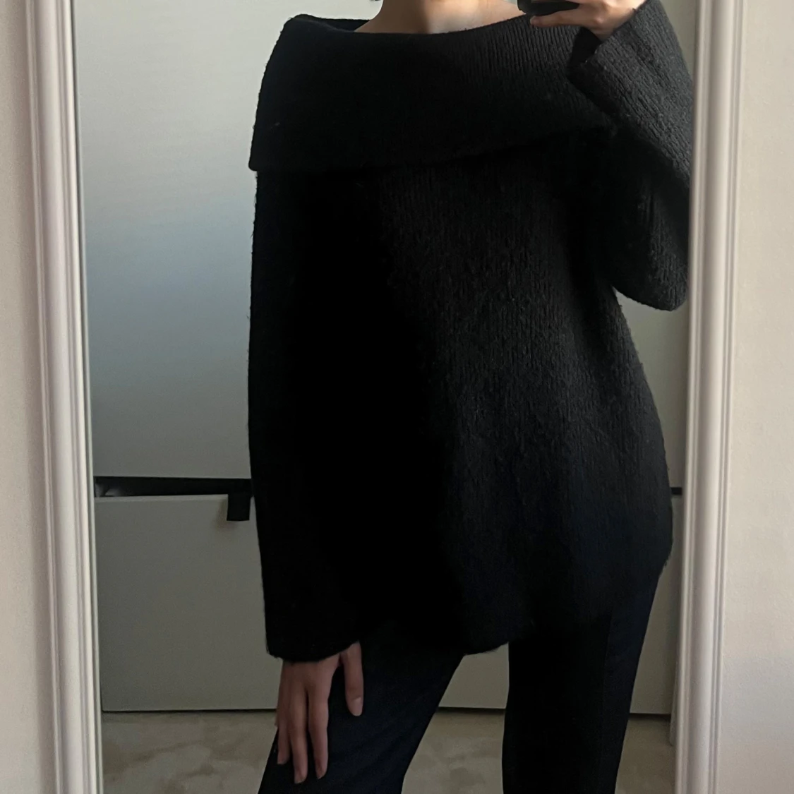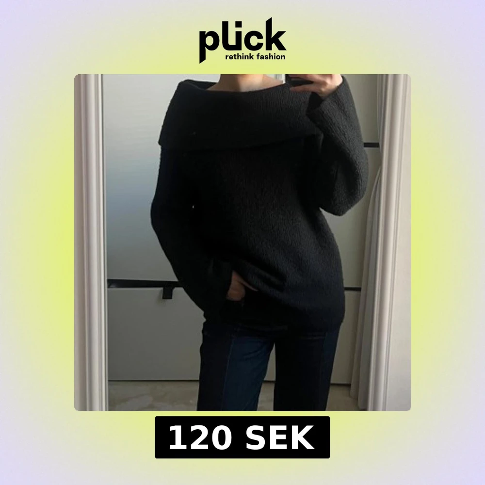 Svart off-shoulder tröja från H&M. Stickad och använd men inget som syns på tröjan. Nypris 300kr. Strl M men passar bra på mig som bär S i vanliga fall.