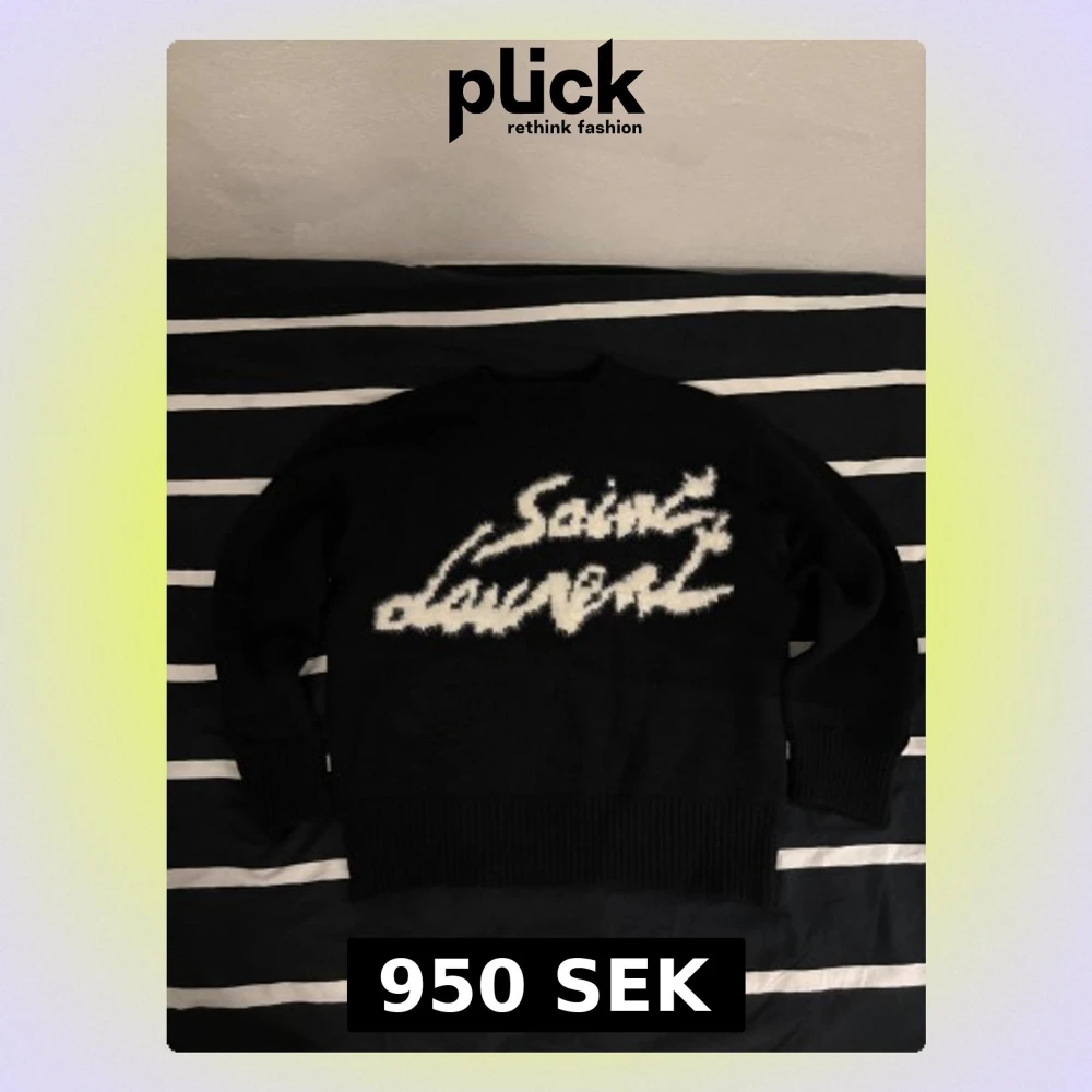 Svart stickad tröja från Saint Laurent med vit, fluffig logotyp framtill. Tröjan har rund hals, ribbade muddar och lång ärm. Materialet känns mjukt och har en lyxig känsla, perfekt för dig som gillar statement-plagg med designerstil. Bara använd ett par gånger, fortfarande rikigt bra skick. Mycket varm o skön nu på vintern. Hör av dig om du har några frågor.