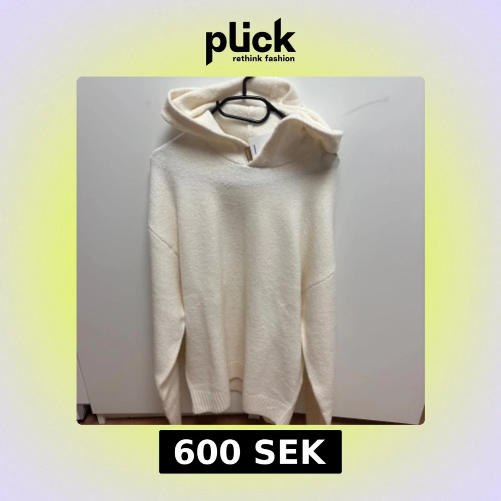 Säljer en stilren vit stickad hoodie med långa ärmar. Perfekt för kyliga dagar med sin mjuka och bekväma passform. Huvan ger en avslappnad look. Storlek Medium säljs för 600kr