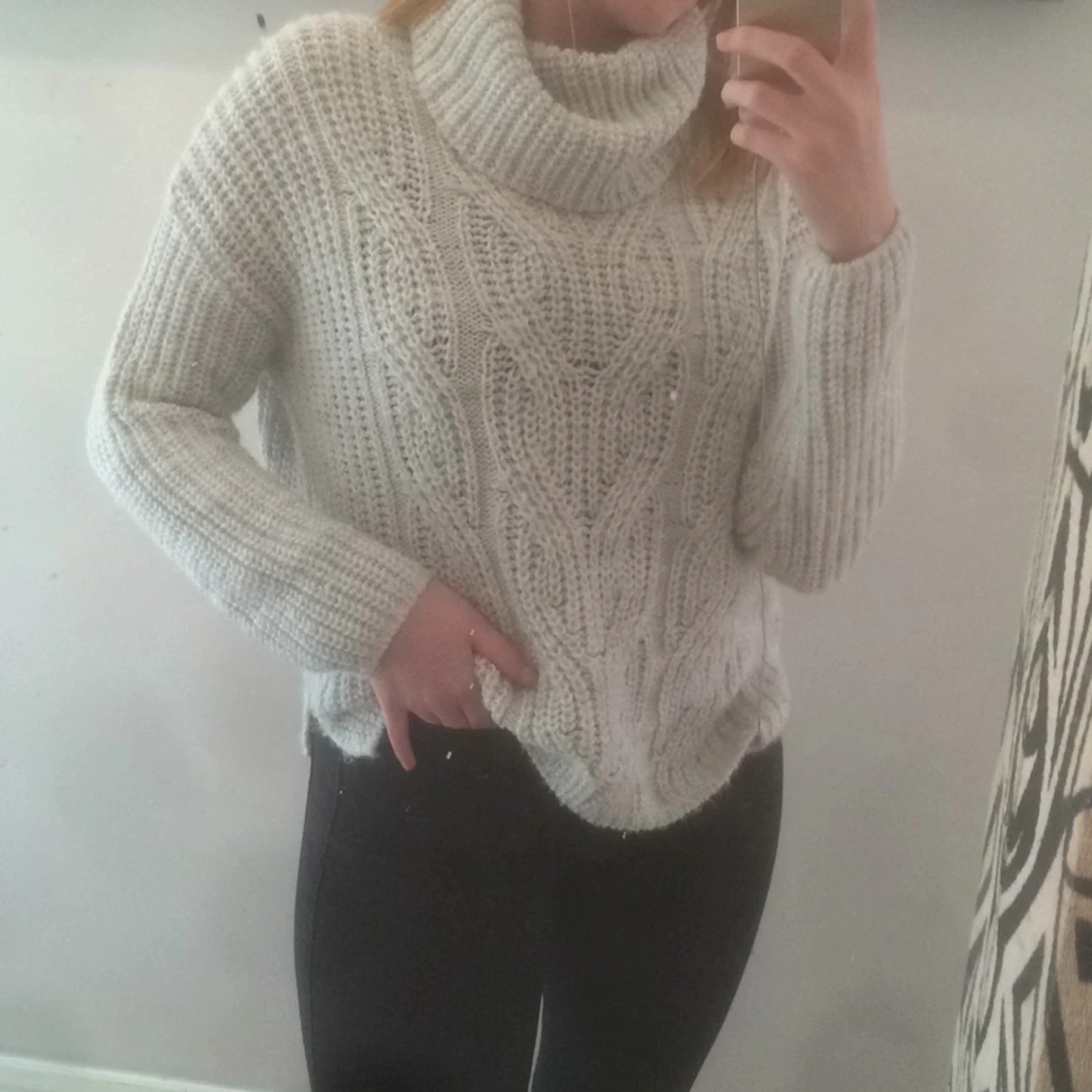 Stickat ljusgrå tröja, passar perfekt till vintern/hösten, otroligt snygg med en skinnjacka exempelvis, passar bra på någon med mindre storlek också!
