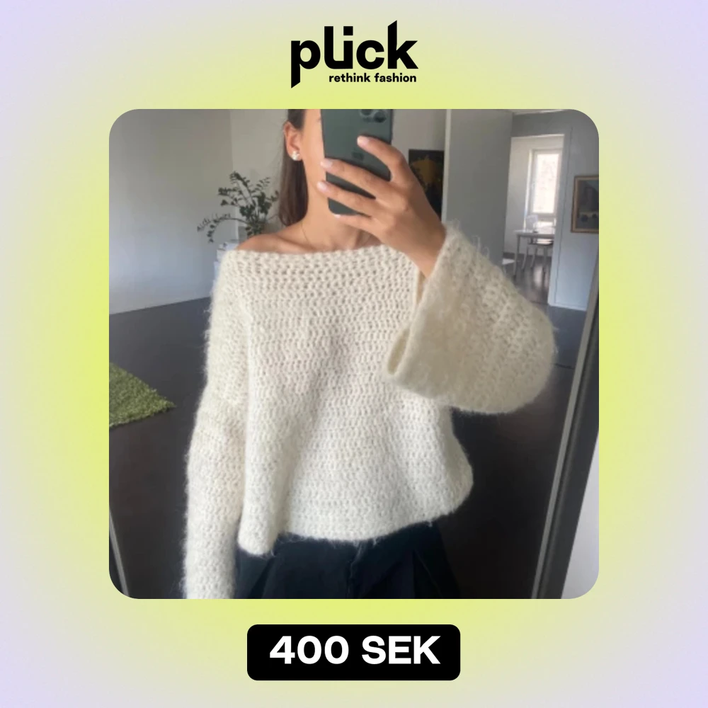 Tröja som jag virkat i 71% alpacka, 25% ull och 4% Polyamid. Naturvit och supermysig!! Gjord efter mina mått och är oversized S/M <3 bred halsringning så är one/offshoulder!!
