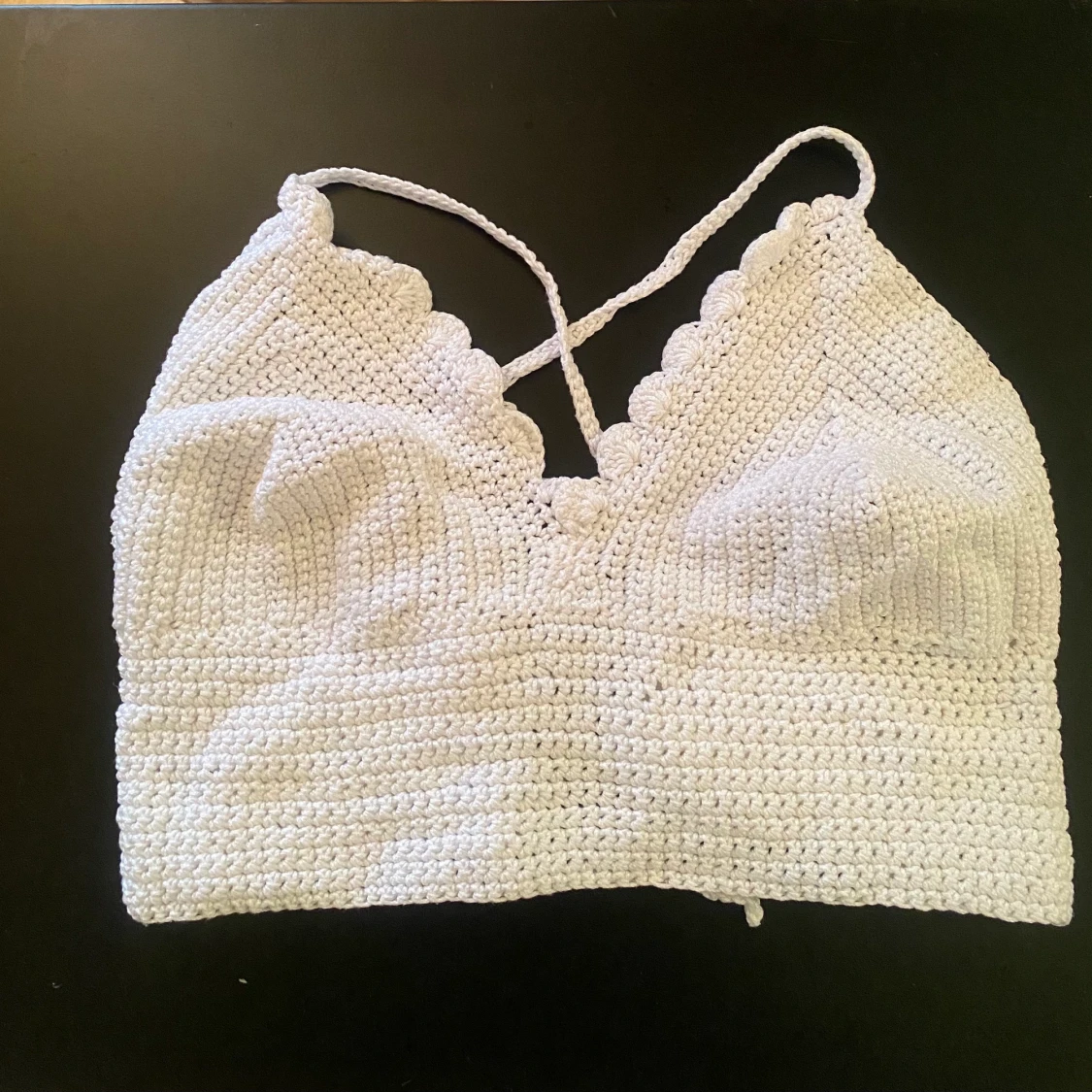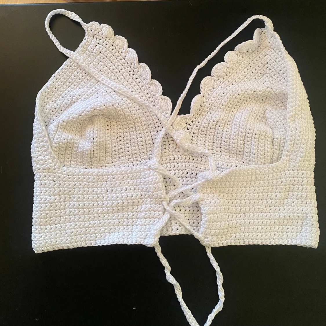 Egen virkad topp. Öppen rygg med knytning där bak. Tog lång tid så det är mkt kärlek bakom denna🥺🥰 passar Xs, A-C kupa🤍🤍