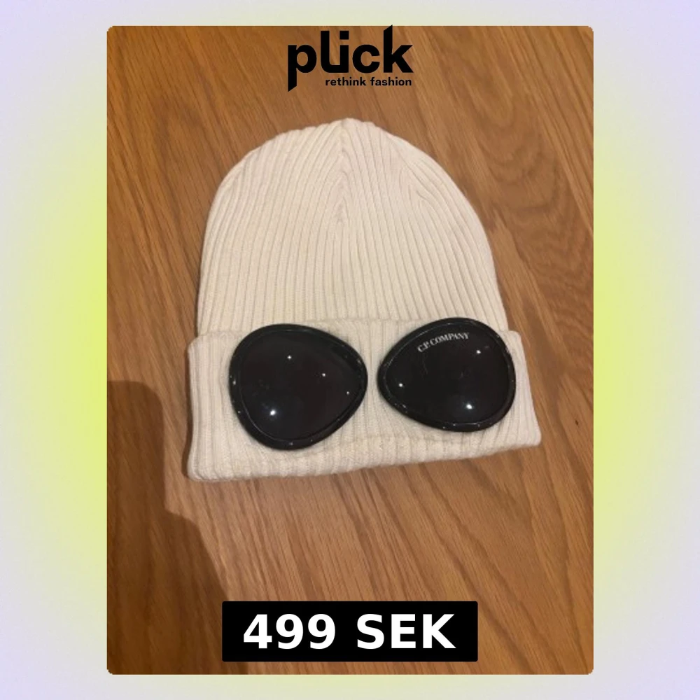 Säljer en ikonisk vit ribbstickad mössa från C.P. Company med svarta goggle-linser framtill. Mössan är tillverkad i mjuk bomull och har en uppvikt kant. Perfekt för dig som vill sticka ut med streetwear-vibe och cool design.