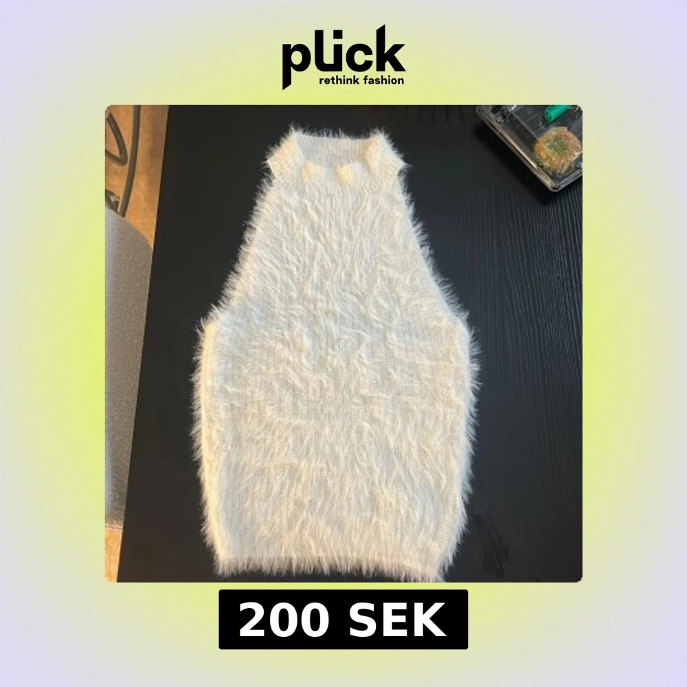 Supermjuk och fluffig vit stickad topp med hög hals och ärmlös design. Toppen har en cool, lite croppad passform och är perfekt för att sticka ut med sin unika textur. Passar snyggt till både jeans och kjol för en trendig look.