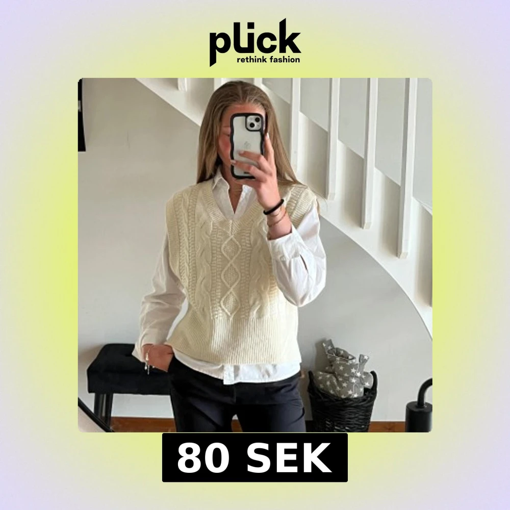 Snygg vit stickad väst med klassiskt kabelstickat mönster och v-ringning. Perfekt att bära över en skjorta för en stilren outfit.🥰