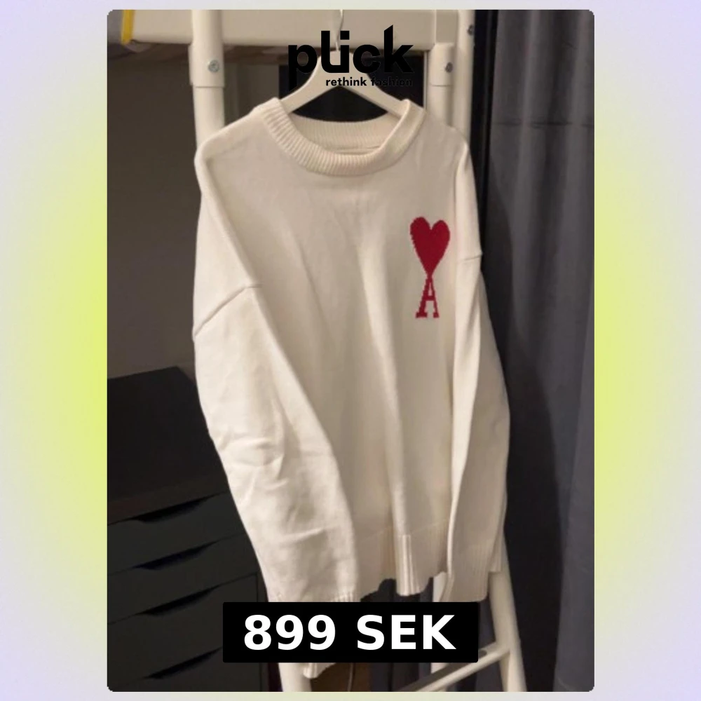 Vit stickad tröja från Ami Paris med röd hjärtlogga och bokstaven A på bröstet. Tröjan har rund hals, ribbade muddar och lång ärm. Perfekt för dig som gillar clean stil med en twist. Materialet är mjukt och håller värmen bra.