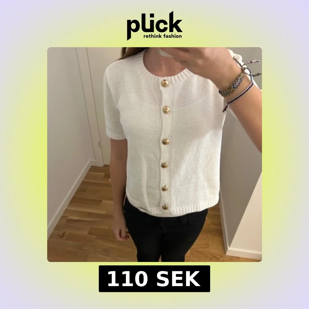 Vit stickad kofta från Sinsay i storlek S-passar XXS eller XS. Kortärmad med rund hals och snygga guldfärgade knappar framtill. Ribbad kant vid hals och nederdel ger en clean look.