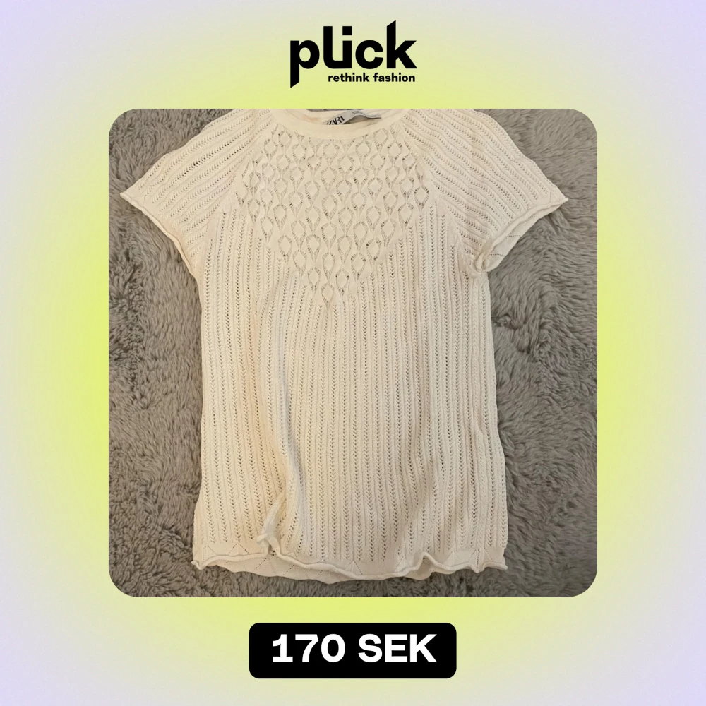 Säljer en söt vit stickad topp från Zara i storlek S. Den har ett fint mönster framtill och korta ärmar. Perfekt för vår och sommar! 🌼