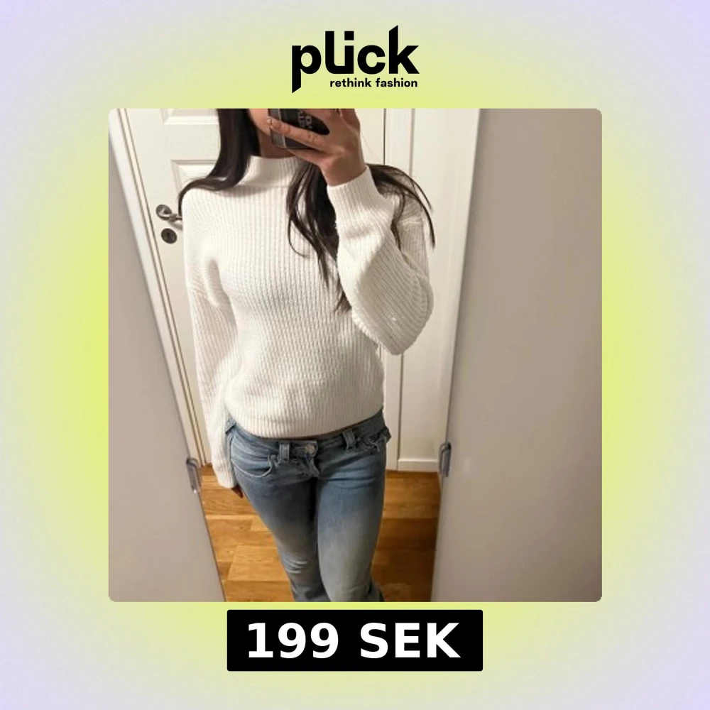 Säljer en stilren vit stickad tröja med ribbad struktur. Tröjan har långa ärmar och en klassisk passform som passar perfekt för kyligare dagar. Perfekt att matcha med jeans för en avslappnad look.