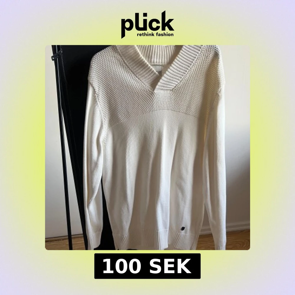 Säljer en stilren vit stickad tröja från Jack & Jones. Tröjan har en v-ringad design med ribbade detaljer vid krage och ärmslut. Perfekt för kyligare dagar och ger en klassisk look.