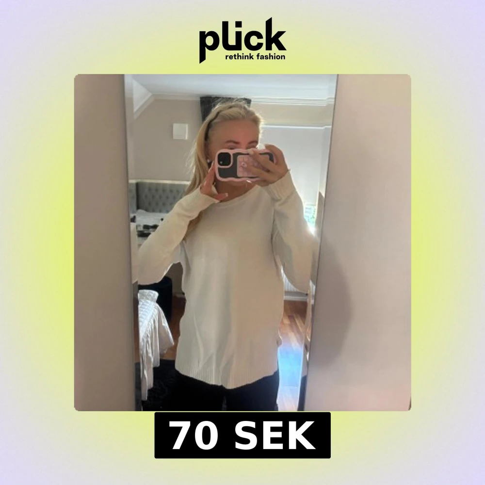 Enkel och stilren vit stickad tröja med rund halsringning och långa ärmar. Den har även en slits på varje sida! Och är lite mera figur sydd en vanliga stickade tröjor, och den är otroligt varm! Köpte den på vila!