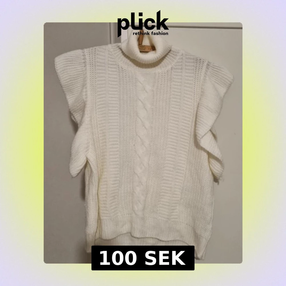 Säljer en vit stickad väst från TEY med polokrage och breda axlar. Västen har ett snyggt flätmönster framtill och ribbade detaljer längs kanterna. Perfekt att styla över en långärmad tröja för extra lager och cool look.