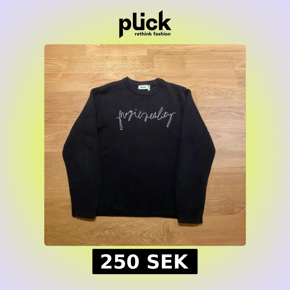 Säljer en svart tröja från Weekday med texten 'magic reality' broderad på framsidan. Tröjan har en rund halsringning och långa ärmar. Perfekt för en stilren och avslappnad look.