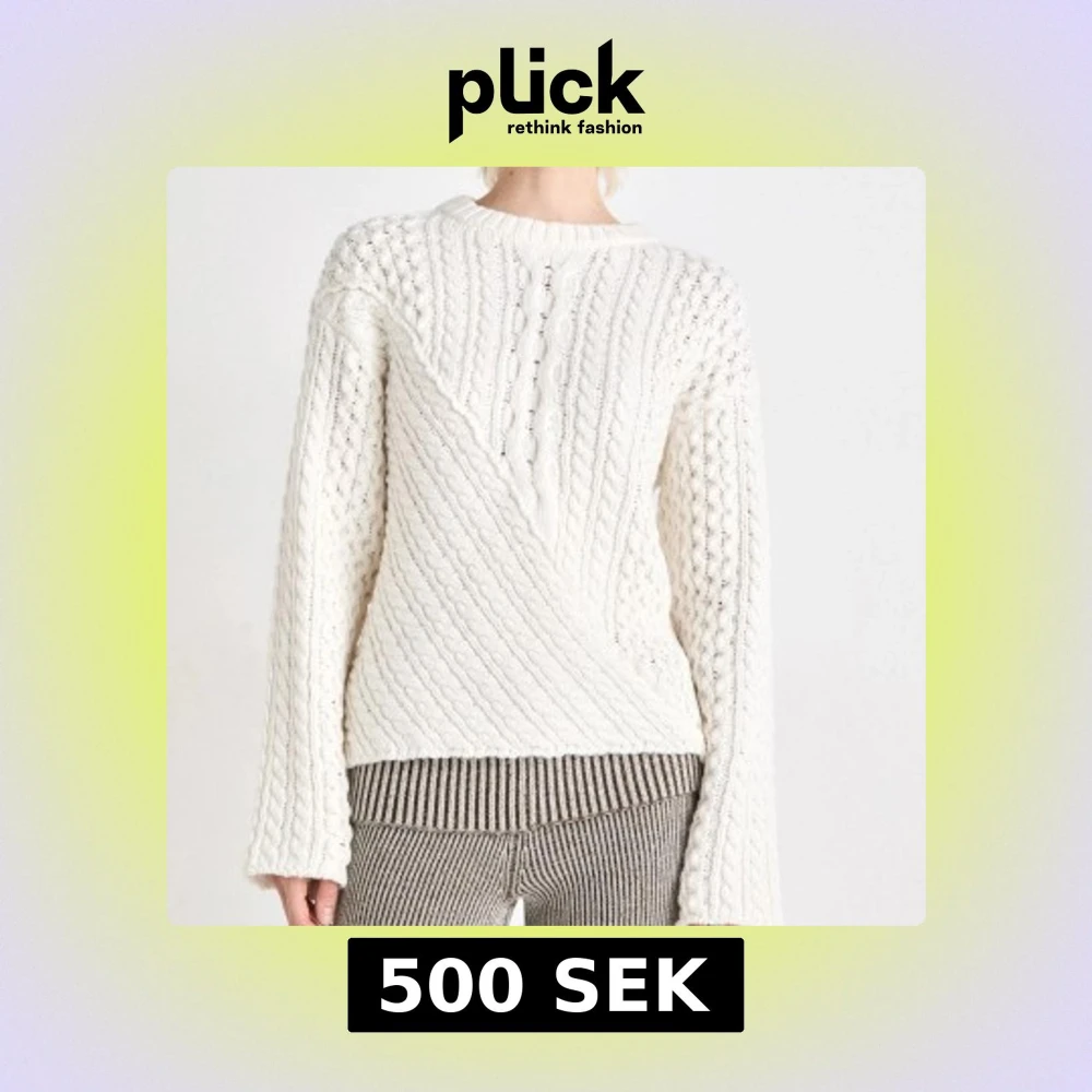 Säljer en vit stickad tröja med snyggt kabelmönster och rund hals. Tröjan har långärmade ärmar och en cool mix av diagonala och vertikala stickningar som ger en unik look. Perfekt för dig som gillar klassisk stil med en twist. Använd 1 gång!