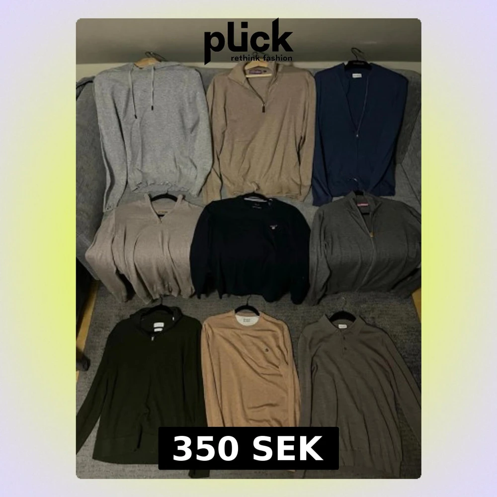 (Alla S förutom grön tröja M). Top rad från vänster: grå William de faye tröja 40% cashmir, beige William de faye tröja 40% cashmir, blå John Henric tröja 100% merino ull. Mellersta raden: Mullvad Stenströms tröja merino ull, Marinblå gant tröja 100% lamm ull, Grå William de faye zip 40% cashmir. Nedre raden: Grön These glory days tröja 100% merinoull, beige scotch & soda 80% viskos, brun John Henric tröja 100% merino ull. 350kr/ tröja.