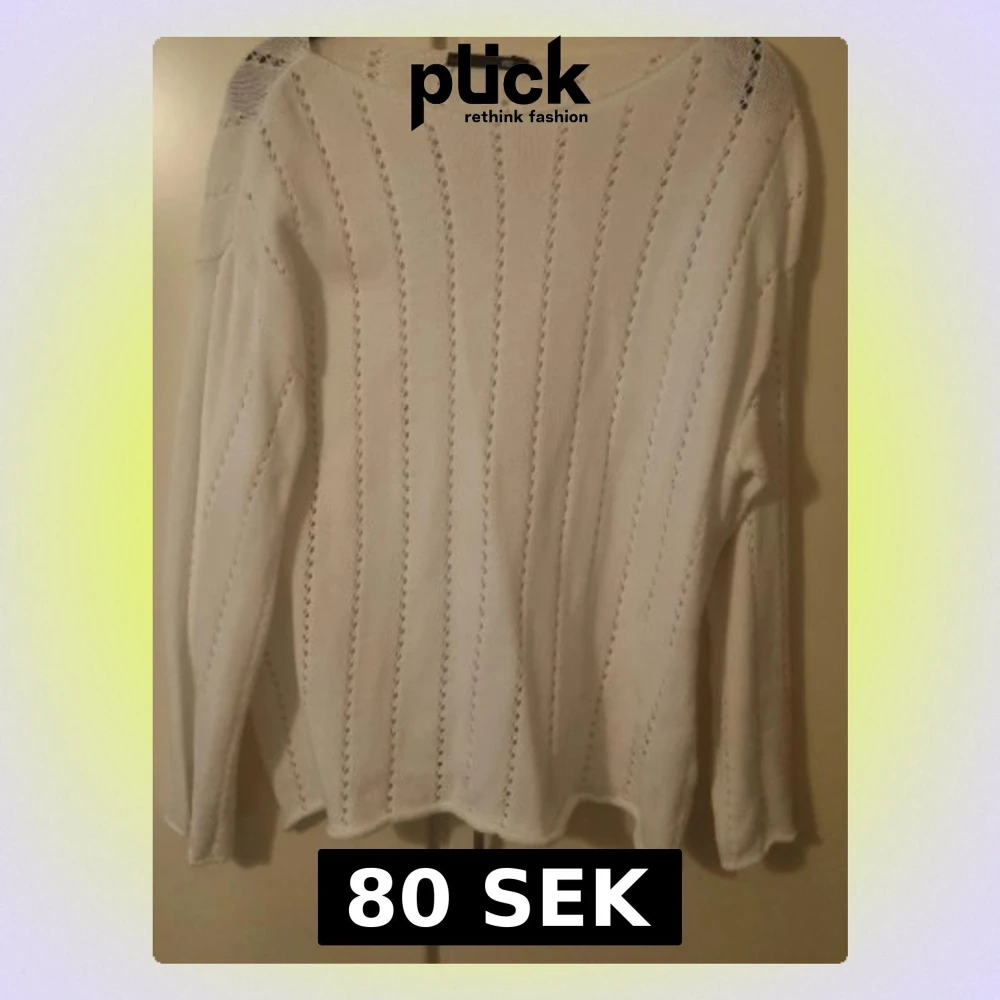 Säljer en vit stickad tröja med lång ärm och dekorativa hålmönster i vertikala rader. Tröjan har rund halsringning och är lätt oversized för en avslappnad look. Perfekt att styla med jeans eller kjol.