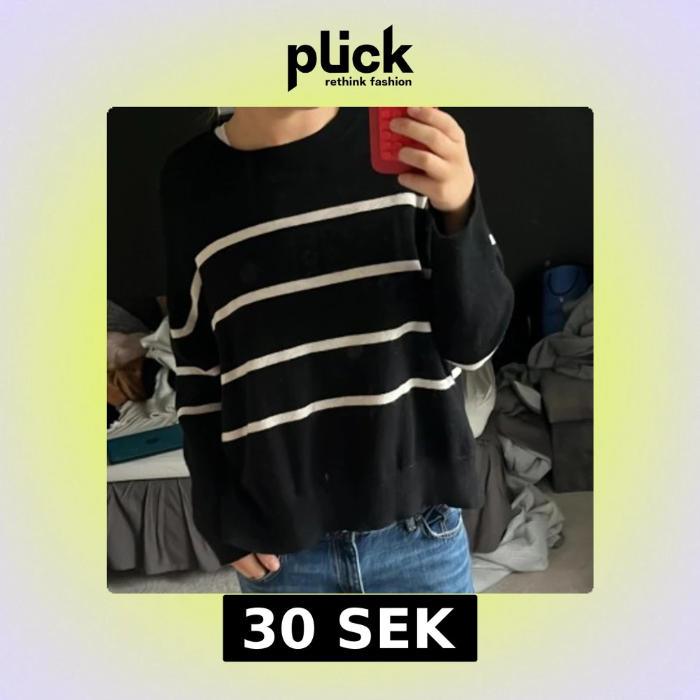 Svart stickad tröja med vita horisontella ränder. Modellen är loose fit med långärmade och rund hals. Perfekt för dig som gillar en chill och enkel stil. Passar till jeans eller andra casual outfits. Storlek XL från BikBok
