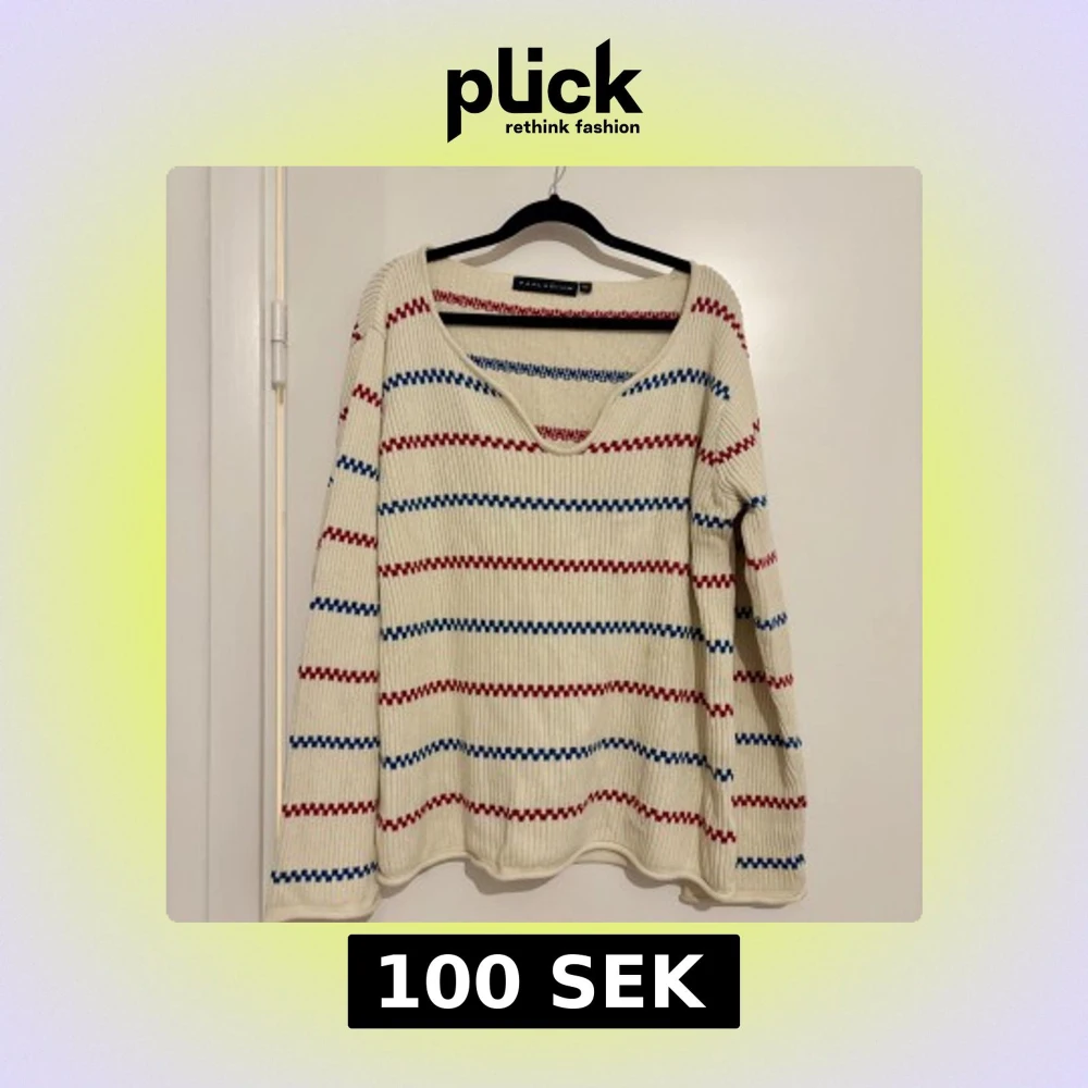 Vit stickad tröja från Palladium med röda och blå horisontella ränder. Tröjan har v-ringning, ribbad struktur och långa ärmar. Perfekt för dig som gillar en avslappnad och snygg stil med lite retrovibbar.