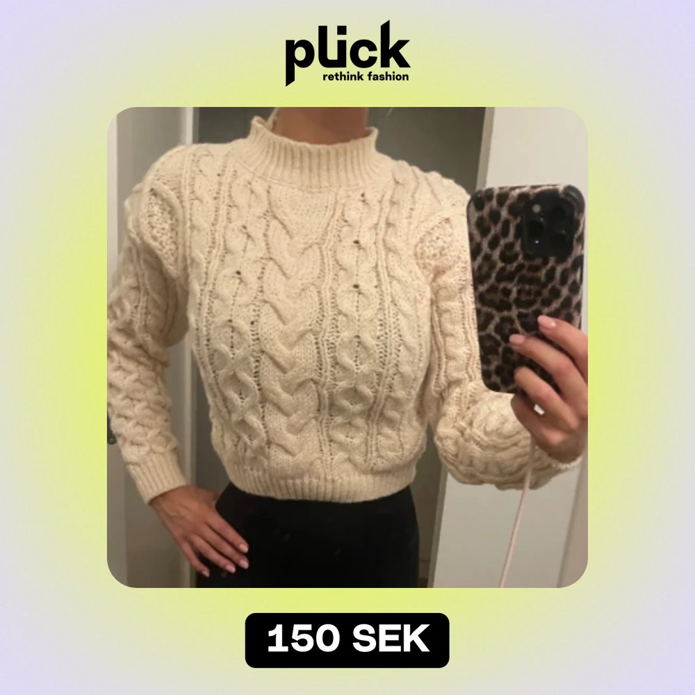 Kabelstickad vit/beige tröja, lite kortare modell som slutar lite över rumpan, sitter fint på men används inte då jag har många liknande