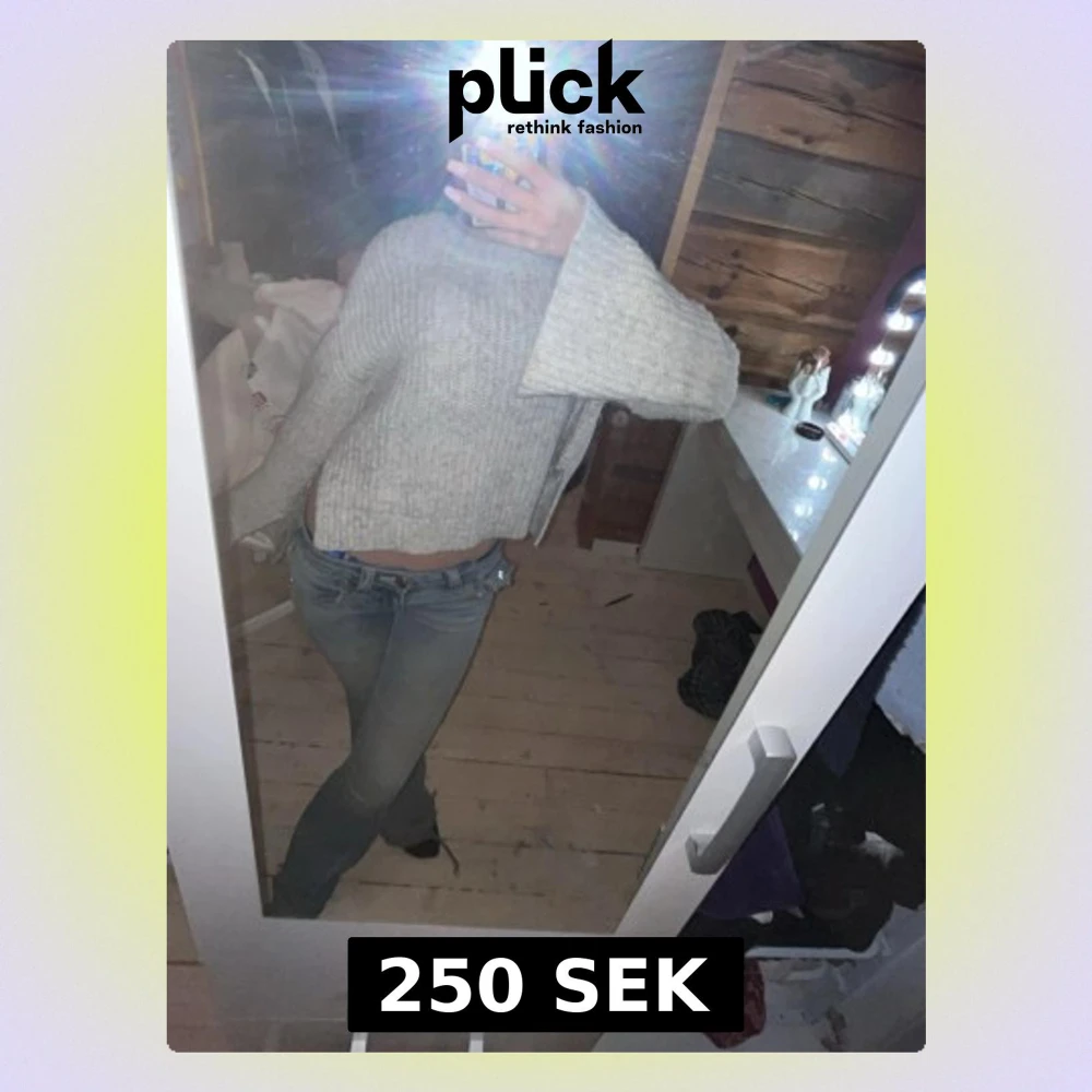 Säljer en grå, croppad stickad tröja med breda ärmar och ribbstickad struktur. Tröjan har en avslappnad passform och är perfekt för lager på lager. Materialet känns mjukt och mysigt, perfekt för kyligare dagar.