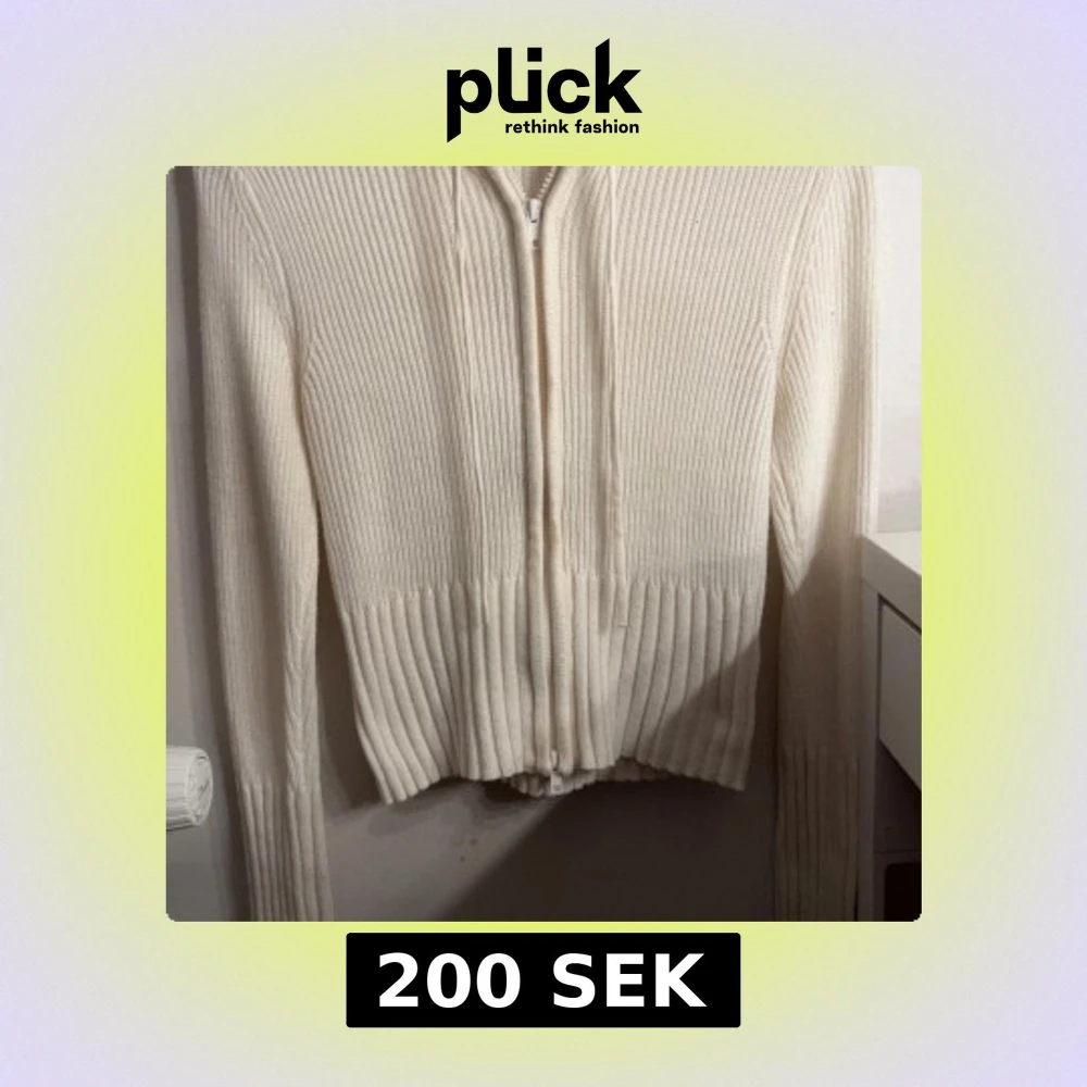 Ribbstickad vit tröja med dragkedja framtill och huva. Tröjan har långa ärmar och ribbad kant nedtill och vid ärmsluten. Perfekt på vintern och chill dagar. Använd 1 gång!