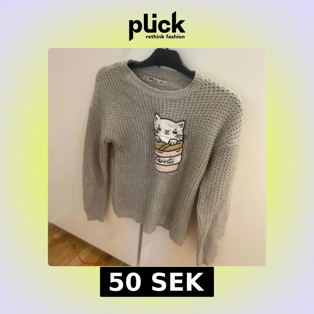 Supermysig beige stickad tröja från FB Sister i storlek XS. Tröjan har ett gulligt broderat kattmotiv på bröstet där en katt sitter i en burrito med texten 'Purrito'. Perfekt för dig som gillar söta detaljer och vill ha en varm tröja med lång ärm.