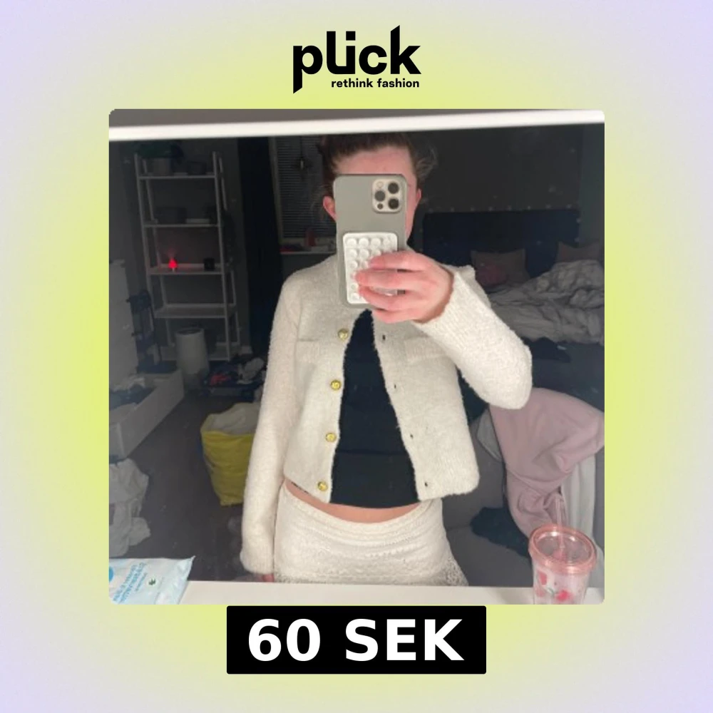 Säljer en fluffig vit stickad kofta från Uniq Studio med guldiga knappar framtill och två dekorativa fickor för att den inte kommer till användning längre. Storleken är 146/152 men passar perfekt för xs!🩷