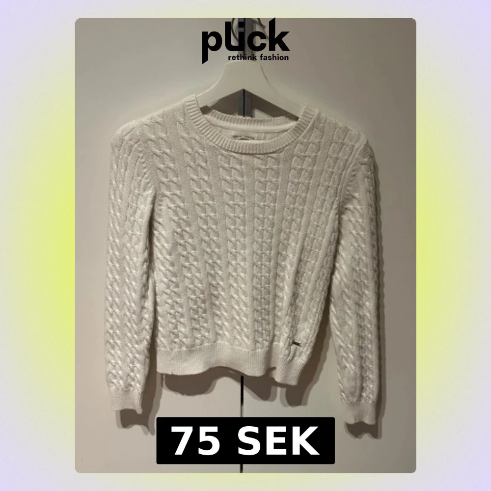 Säljer en vit kabelstickad tröja från Holly & Whyte med rund halsringning och ribbade muddar. Tröjan har ett klassiskt flätmönster och är perfekt för att hålla sig varm under kyliga dagar. Materialet är mjukt och bekvämt.