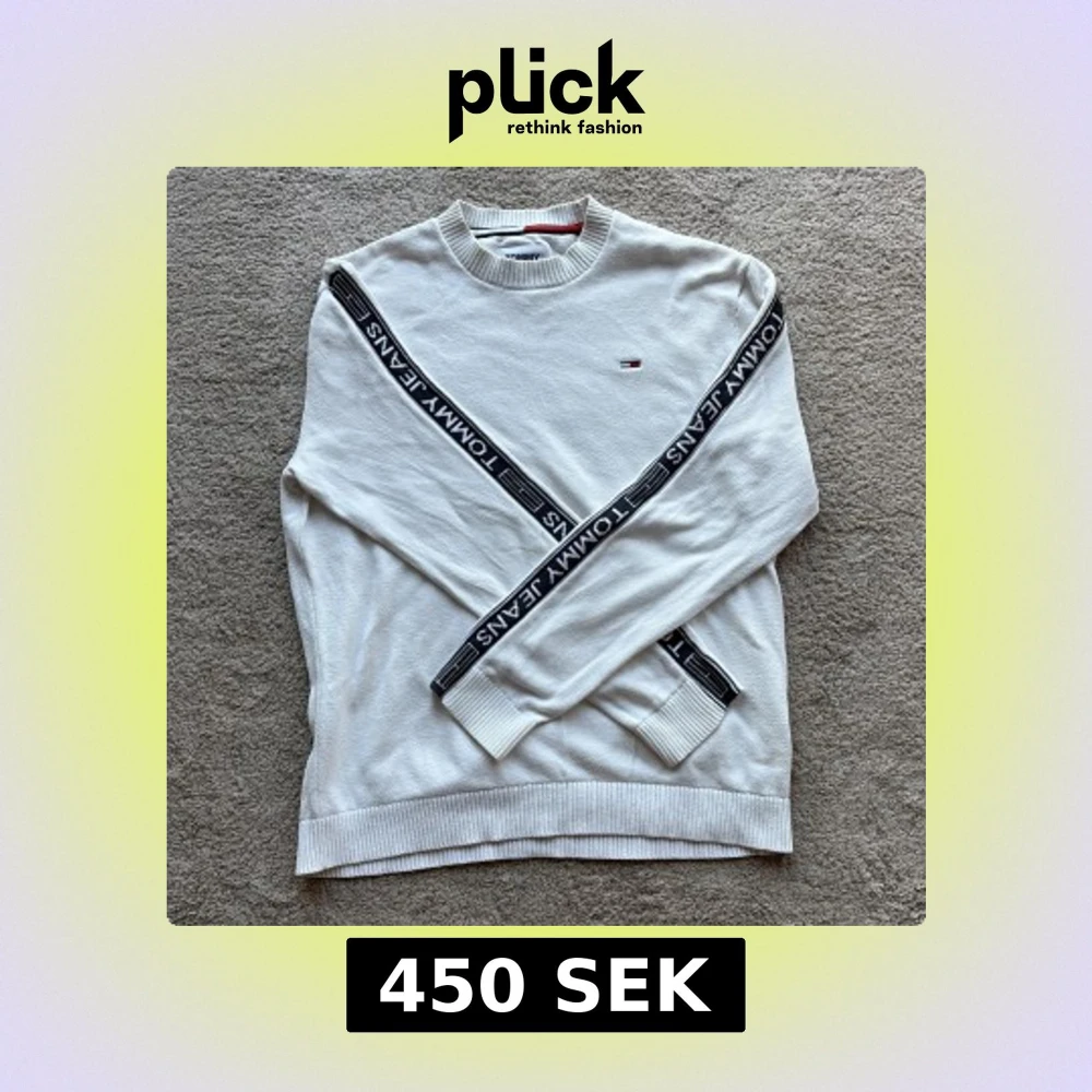Vit stickad tröja från Tommy Jeans i storlek XS. Tröjan har svarta band med loggan diagonalt över framsidan och små broderade Tommy Jeans-flaggan på bröstet. Rund hals och ribbade muddar vid ärmslut och nederkant. Perfekt för dig som gillar street och snygga detaljer.