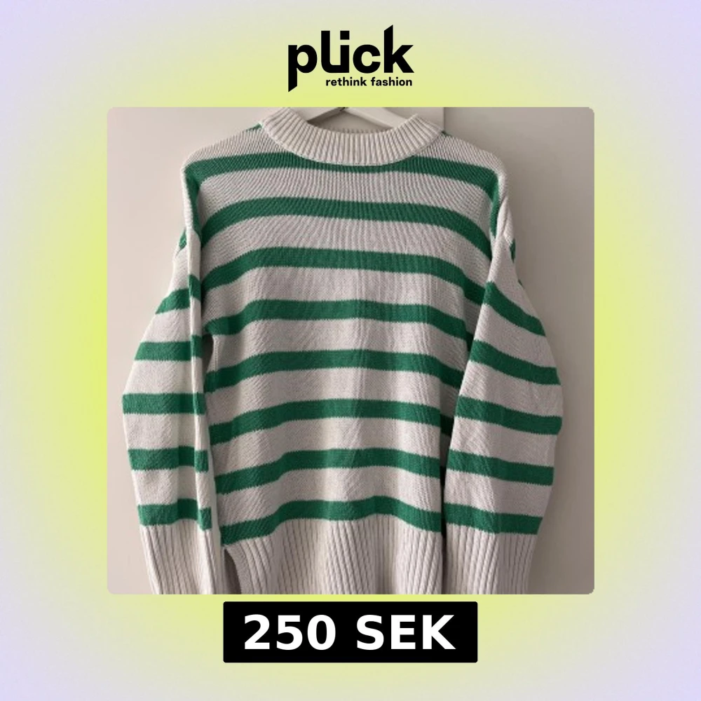 Så mysig tjocktröja i gröna/vita ränder, och slits på vardera sida nertill💚 Använd några gånger men i väldigt bra skick! Är stor i storleken så passar både XS, S och M, beroende på hur man vill att den ska sitta på