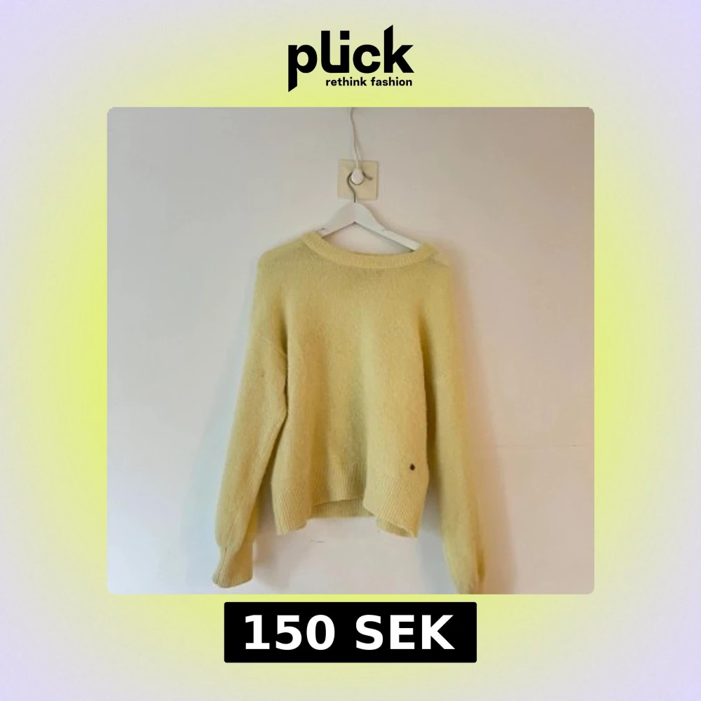 Mysig ljusgul stickad tröja med rund halsringning och långa ärmar.