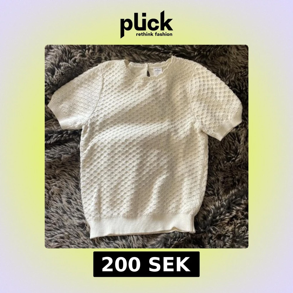 Säljer en vit stickad topp från Melrose and Market i storlek XS. Tröjan har korta ärmar, rund hals och ett snyggt strukturerat mönster över hela plagget. Baksidan har en liten knappdetalj vid halsen. Perfekt för dig som gillar stilrena och mjuka plagg.