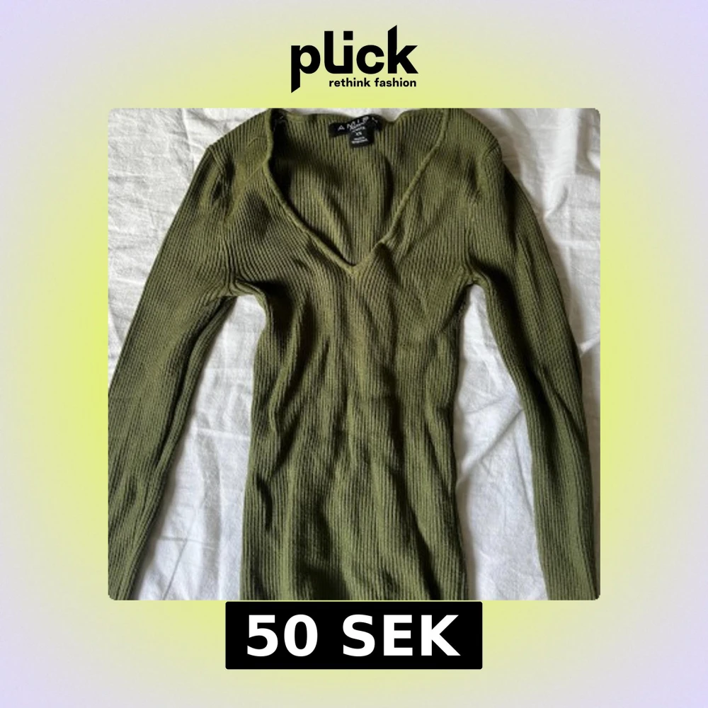 Säljer en olivgrön ribbad tröja från Amisu i storlek XS. Tröjan har lång ärm, v-ringad hals och är figurnära i modellen. Perfekt för lager på lager och enkel att styla med jeans eller kjol.